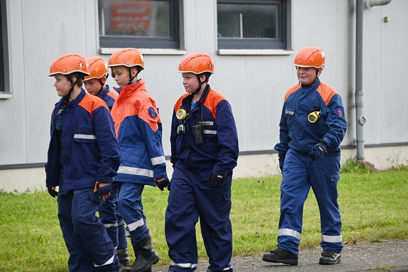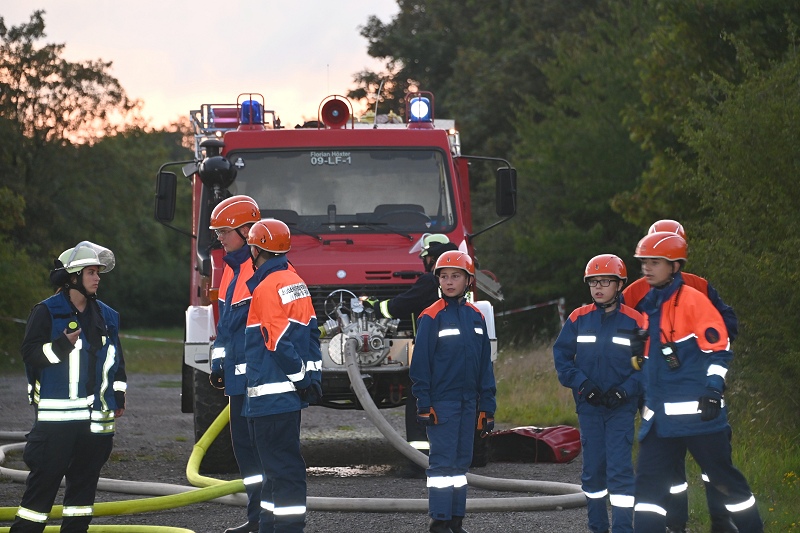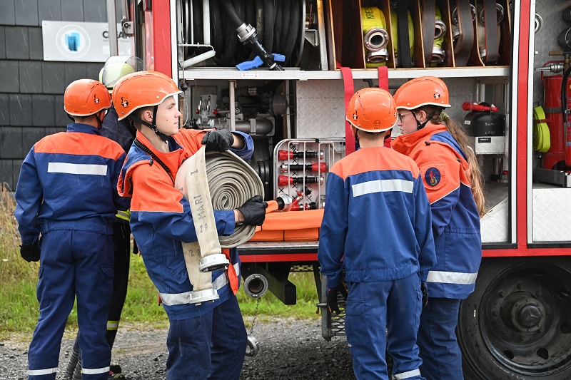 Erst am Abend wurde es im wahrsten Sinne des Wortes wieder „heiß“. Ein Brand in einer Halle im Industriegebiet, bei dem sich zwei Personen in Lebensgefahr befanden, musste bewältigt werden. „In der Feuerwehrsprache heißt das dann 'Feuer-MIG' – also eine Feuermeldung, bei der sich Menschenleben in Gefahr befinden“, erklärt Patrick Wichmann. Im Industriegebiet Lüre gab es dann auch alle Hände voll zu tun, zwei versteckte Puppen warteten in der vernebelten Halle der Fahrschule Schelhorn auf Hilfe. Da war ein schneller Löschangriff nebst Menschenrettung vonnöten, bei der jeder Handgriff sitzen musste. Weiter ging es erst nach dem abendlichen Grillen um 21:30 Uhr mit einer Feuermeldung auf dem Flugplatz Höxter-Holzminden, wo ein Haufen Paletten in Flammen stand. Schon von weitem waren die Flammen und der Rauch zu sehen. „Geil, ein echter Brand“, meinte die 16-jährige Jugendfeuerwehrfrau Sophie. Wieder hieß es, einen Löschangriff von allen Seiten aufzubauen, um das Feuer zu bekämpfen. Nachdem auch dieser Einsatz bewältigt und die Feuerwehrgeräte wieder einsatzbereit verstaut waren, hieß es erneut „Ruhezeit ist angesagt“. Damit war um 02:00 Uhr morgens jedoch Schluss: Großalarm mit dem hausinternem Gong! Bei dem Alarm handelte es sich um eine Personensuche auf einer Wiese nahe dem Freizeitsee, wo sporadisch Hilfeschreie vernommen wurden. Nicht jedes Jugendfeuerwehrmitglied wurde gleich sofort bei dem Alarm wach. Doch die Müdigkeit besiegten sie schnell und der Einsatz konnte starten. Mit Taschenlampen bewaffnet suchten die Jugendfeuerwehrleute in einer Reihe das Gebiet ab und fanden auf dem Spielplatz die hilfsbedürftige Person, womit sie ihr das Leben retteten. Mit einem Fehlalarm um 07:00 Uhr Morgens endete die Schicht des Berufsfeuerwehrtages. Nach einem gemeinsamen Aufräumen und einer anschließenden Fahrzeug- und Gerätepflege war um 10 Uhr Schichtende. Für den 13-jährigen Benedikt aus Höxter war es der erste Jugendfeuerwehrdienst und davon war er so begeistert, dass er ab sofort „Feuer und Flamme“ für die Feuerwehrarbeit ist. „Gerne sind neue Mitglieder bei uns willkommen! Feuerwehr macht viel Spaß und ist garantiert nicht 'cringe'“, betont Jugendwart Patrick Wichmann.