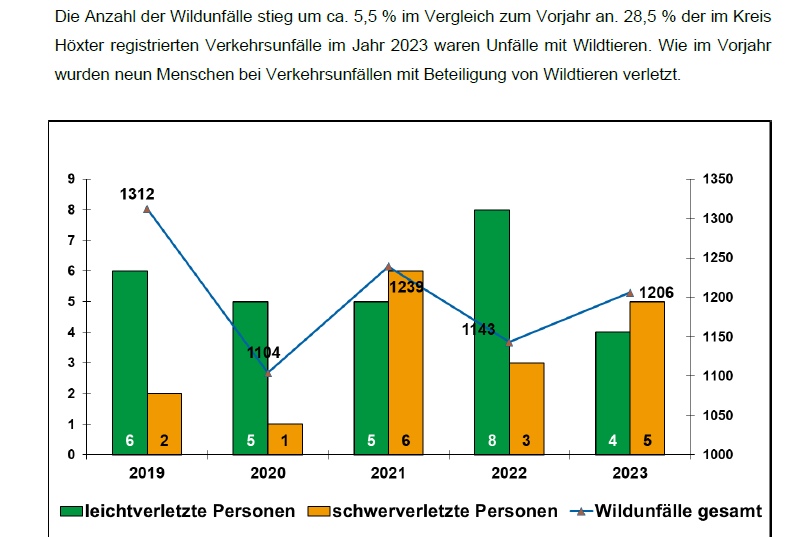 Verkehrsunfälle mit Fahrrädern und Pedelecs nehmen ebenfalls zu, wobei die Unfallursachen oft auf nicht angepasste Geschwindigkeit und mangelnde Rücksichtnahme zurückzuführen seien. Auffallend ist auch die hohe Anzahl von Wildunfällen, die auf Geschwindigkeitsüberschreitungen zurückzuführen sind. „Es ist daher von entscheidender Bedeutung, die Geschwindigkeit in Gebieten mit Wildwechsel zu reduzieren, um Kollisionen zu vermeiden und sowohl Menschen als auch Tieren eine Chance zu geben“, sagt Tewes. Die Anzahl der Wildunfälle stieg um ca. 5,5 Prozent im Vergleich zum Vorjahr an. 28,5 Prozent der im Kreis Höxter registrierten Verkehrsunfälle im Jahr 2023 waren Unfälle mit Wildtieren. Wie im Vorjahr wurden neun Menschen bei Verkehrsunfällen mit Beteiligung von Wildtieren verletzt.