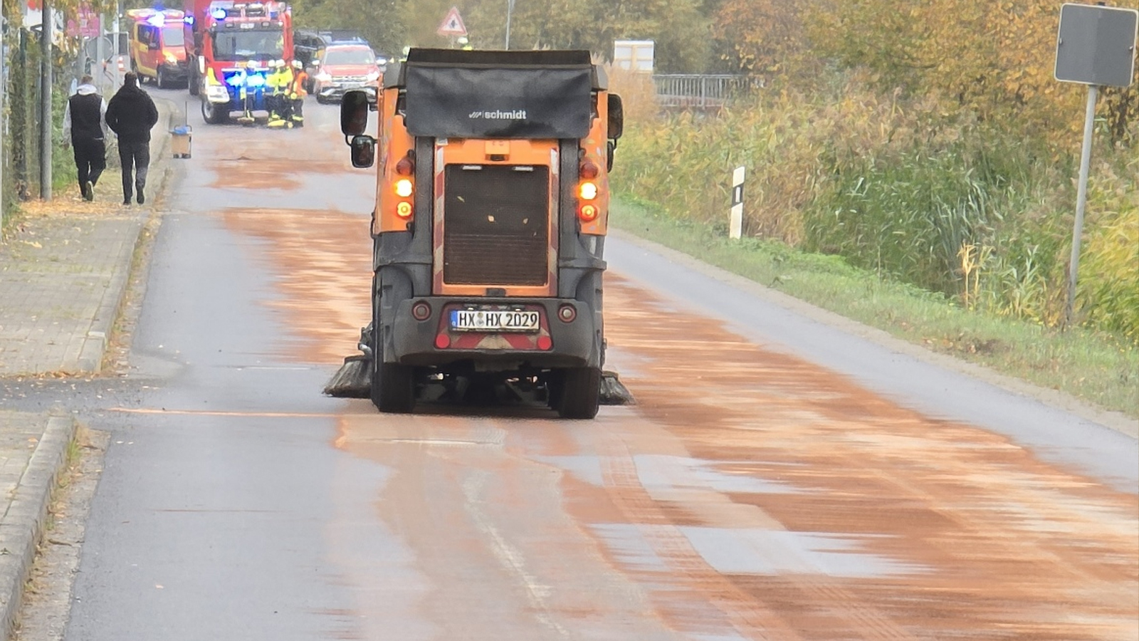 Stahle/Höxter (red). Eine mehrere Kilometer lange Dieselspur hat am vergangenen Samstagvormittag einen Großeinsatz für Feuerwehr und Polizei in Höxter ausgelöst. Von Albaxen über Stahle und die Bundesstraße 64 bis auf den Parkplatz des OBI-Baumarktes zog sich ein schmieriger Ölfilm, der für erhebliche Verkehrsbehinderungen sorgte und zahlreiche Einsatzkräfte beschäftigte. Gegen 10.30 Uhr gingen die ersten Meldungen über eine Verunreinigung der Fahrbahn im Bereich des Industriegebietes ein. Die Löschgruppen aus Albaxen, Stahle und Höxter sowie Kräfte der Kreispolizeibehörde rückten umgehend aus. Insgesamt waren 25 Feuerwehrkräfte mit mehreren Fahrzeugen vor Ort.