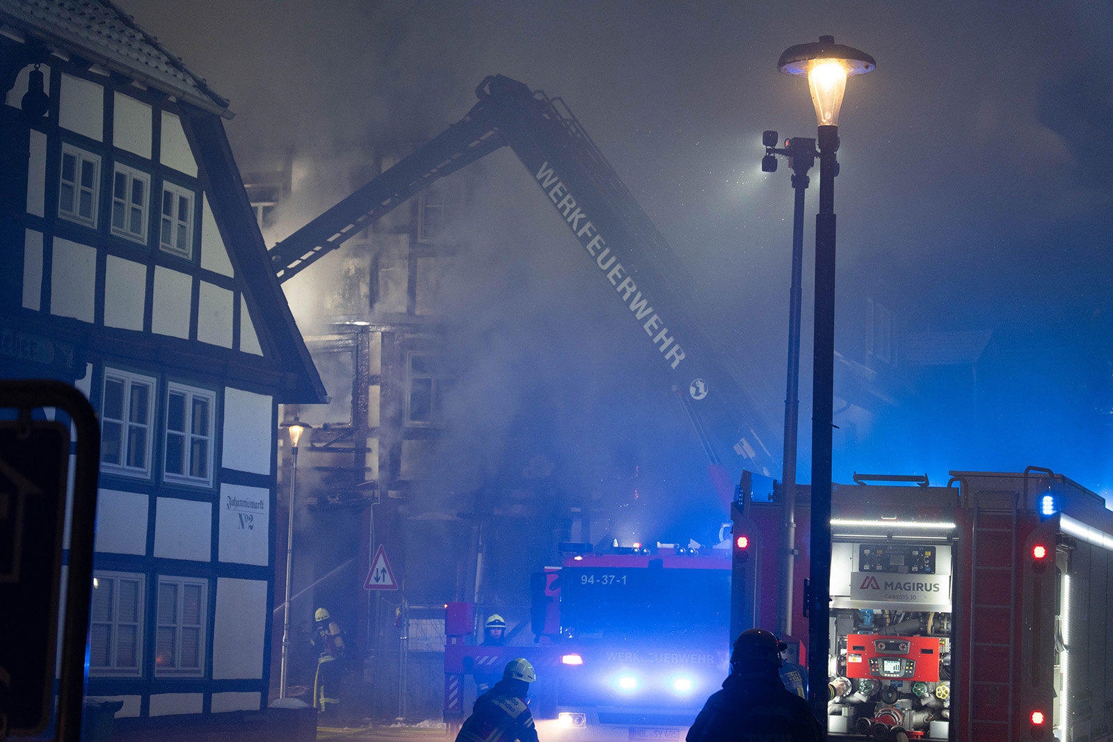 Holzminden (zir). Ein gemeldetes Feuer in einer Wohnung in der Johannisstraße hat am frühen Donnerstagmorgen einen Großeinsatz der Feuerwehr ausgelöst. Um 4:43 Uhr wurden die Einsatzkräfte zu einem Brand in einem Gebäude in der Johannisstraße alarmiert. Bereits beim Eintreffen stand das Untergeschoss in Vollbrand, die Flammen hatten zu diesem Zeitpunkt bereits auf das erste Obergeschoss übergegriffen.
