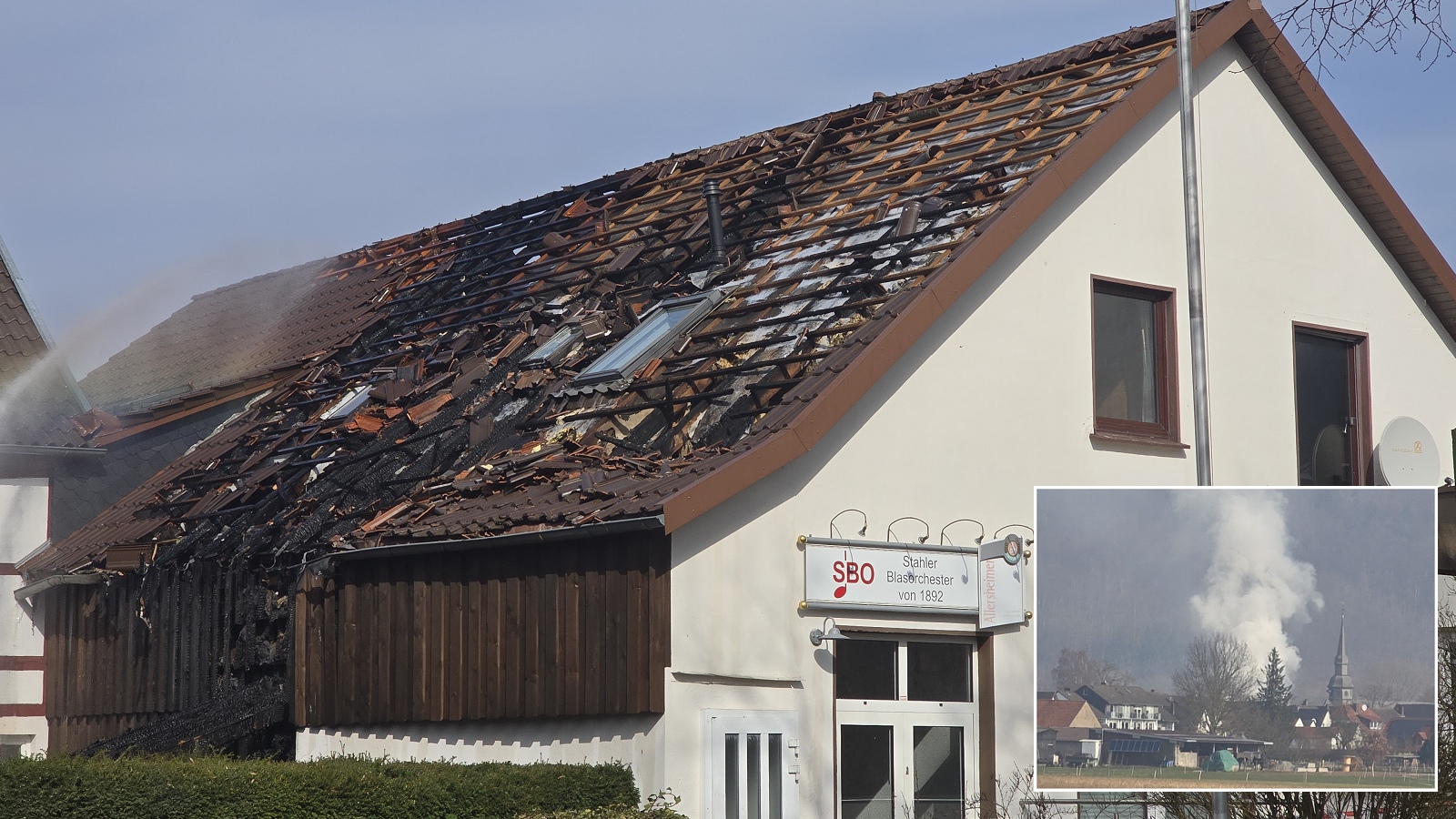 Stahle (red). Ein Großbrand hat am Sonntagmorgen das Vereinsheim des Stahler Blasorchesters mit der angeschlossenen Musikschule, das zwischen der Sparkasse und der Stahler Kirche gelegen ist, zerstört. Das Feuer brach gegen 9.15 Uhr aus und richtete einen Schaden in Höhe von mehreren hunderttausend Euro an. Zunächst war der Feuerwehr ein Brand in einem Anbau des Gebäudes gemeldet worden. Die Rauchsäule direkt an der Stahler Kirche war kilometerweit sichtbar, wie Anwohner berichteten. Als die ersten Einsatzkräfte der Löschgruppen Albaxen und Stahle der Freiwilligen Feuerwehr Höxter am Einsatzort eintrafen, stand der Anbau bereits in voller Ausdehnung in Flammen. Die Feuerwehr begann umgehend mit den Löscharbeiten. Allerdings hatte sich das Feuer laut der Einsatzkräfte vor Ort bereits bis in den Dachbereich des Gebäudes ausgebreitet, sodass weitere Kräfte nachalarmiert werden mussten. Zur Unterstützung rückten der Löschzug Höxter sowie die Ortsfeuerwehr Holzminden mit ihren Drehleiterfahrzeugen und mehreren Tanklöschfahrzeugen an.