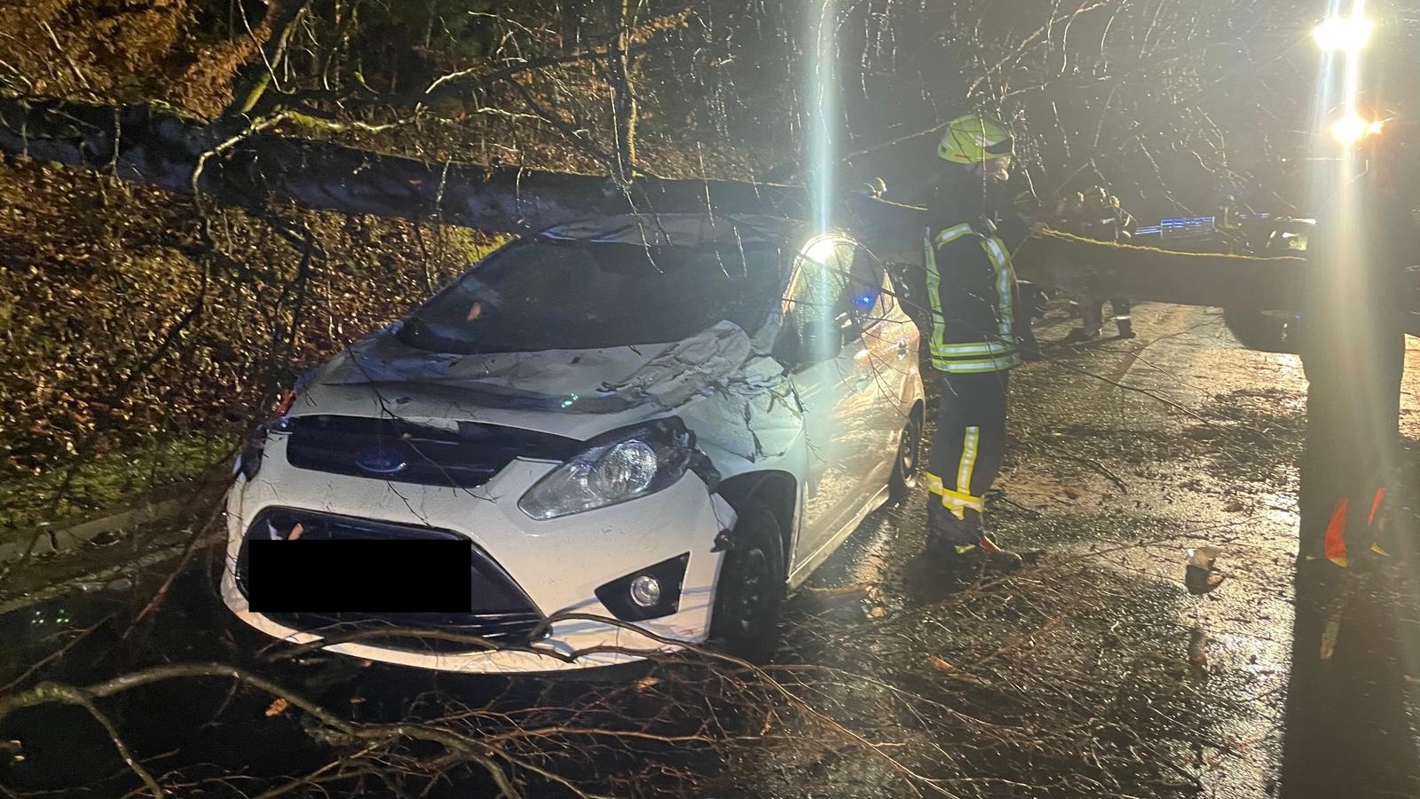 Auf der K50 kam es zu einem Verkehrsunfall, bei dem zwei Pkw in einen umgestürzten Baum fuhren. Zwei Erwachsene sowie ein kleines Kind wurden dabei verletzt. Rund 20 Einsatzkräfte der Feuerwehr waren vor Ort im Einsatz. Mit Hilfe des Rüstwagens und dessen Seilwinde wurde der Baum von den Fahrzeugen entfernt.