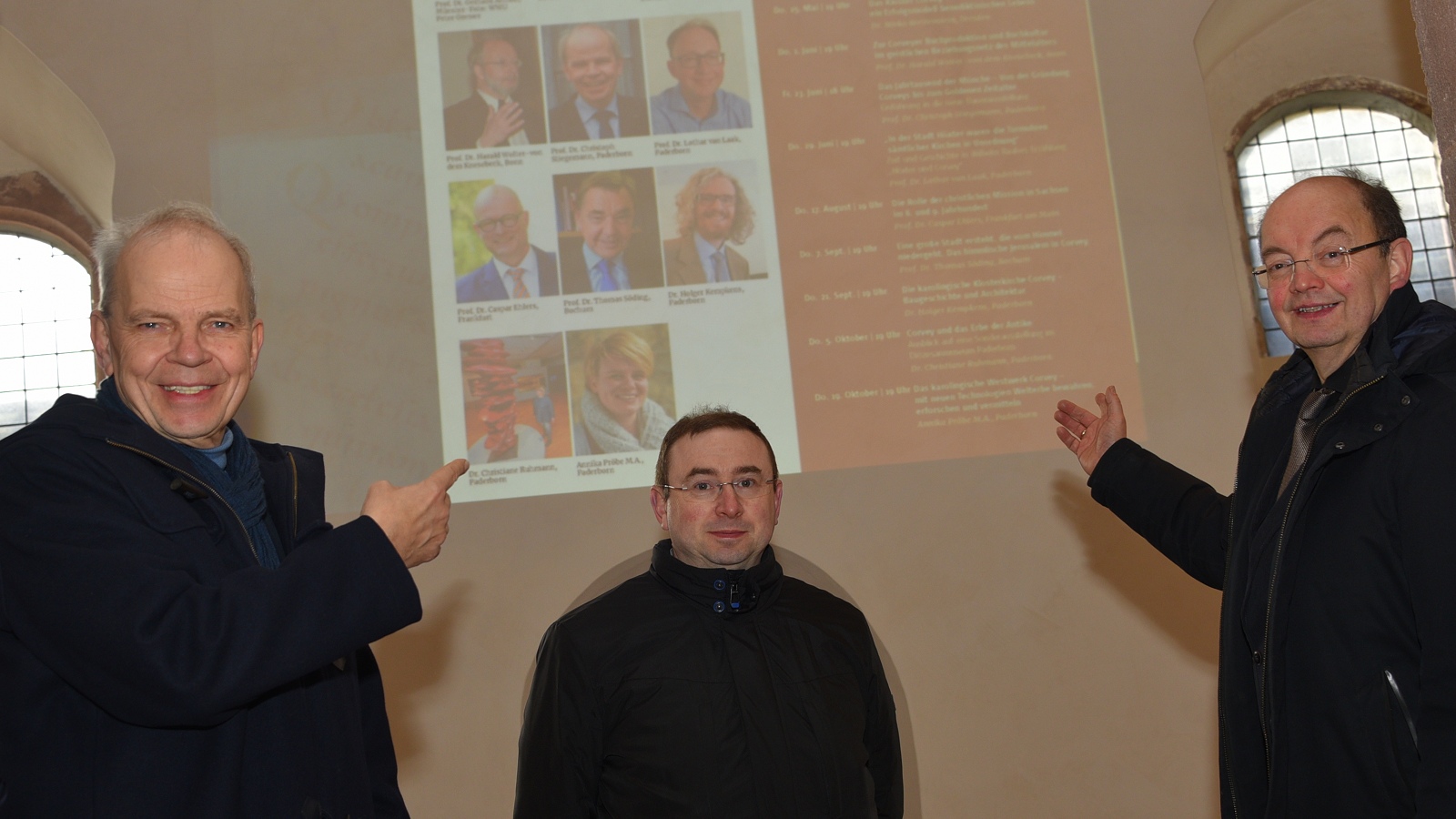 Die Reise beginnt am Sonntag, den 23. April 2023, mit der „Sachsengeschichte“ des Benediktinermönchs Widukind von Corvey durch den Münsteraner Mediävist Professor Dr. Gerhard Althoff, der einer der besten Kenner des Teils dieser Geschichte ist. Sein Vortrag trägt den Titel: „Widukind von Corvey: Ein Meister diskreter Hinweise“. Die Paderborner Stadtarchäologin Dr. Sveva Gai, eine gebürtige Römerin, beleuchtet am Donnerstag, den 11. Mai, die Bauhistorie der großen Abtei. Von der Baugeschichte schlägt die „Zeitreise“ dann einen Bogen zum Leben und Wirken der Mönche. Privatdozent Dr. Mirko Breitenstein aus Dresden referiert am Donnerstag, den 25. Mai, über „Das Kloster Corvey – ein Erfolgsmodell benediktinischen Lebens“. Am Donnerstag, den 1. Juni, führt die Reise ins Skriptorium des Klosters. Kunsthistoriker Professor Dr. Harald Wolter von dem Knesebeck aus Bonn spricht zur „Corveyer Buchproduktion und Buchkultur im geistlichen Beziehungsnetz des Mittelalters“. Am Freitag, den 23. Juni, führt Professor Dr. Christoph Stiegemann aus Paderborn in die neue Dauerausstellung „Das Jahrtausend der Mönche - Von der Gründung Corveys bis zum Goldenen Zeitalter“ in den Räumen des Schlosses ein. Diese Veranstaltung beginnt bereits schon 18 Uhr. Ins 17. Jahrhundert führt die „Zeitreise“ am Donnerstag, den 29. Juni. Im Blickpunkt steht eine Erzählung Wilhelm Raabes (1831 – 1910). Referent Professor Dr. Lothar van Laak aus Paderborn stellt seinen Vortrag unter die Überschrift „In der Stadt Höxter waren die Turmuhren sämtlicher Kirchen in Unordnung. Der nächste Vortragsabend, am Donnerstag, den 17. August, nimmt Bezug auf Corveys Geschichte als Missionszentrum. Professor Dr. Caspar Ehlers aus Frankfurt am Main referiert über „Die Rolle der christlichen Mission in Sachsen im 8. und 9. Jahrhundert“. Als irdisches Abbild des Himmlischen Jerusalems erleben die Besucher das Kloster Corvey beim Vortragsabend am Donnerstag, den 7. September. Professor. Dr. Thomas Söding aus Bochum spricht zum Thema „Eine große Stadt ersteht, die vom Himmel niedergeht. Das himmlische Jerusalem in Corvey“. Er nimmt dabei Bezug auf die Inschrift der berühmten Grundsteinplatte am Westwerk aus der ersten Klosterkirche von vor 844. Weiter geht die Zeitreise am Donnerstag, den 21. September, mit dem Direktor des Diözesanmuseums Paderborn, Dr. Holger Kempkens. Er erläutert „Die karolingische Klosterkirche Corvey - Baugeschichte und Architektur“. Dem Thema des Kulturtransfers widmet sich am Donnerstag, den 5. Oktober der Vortrag: „Corvey und das Erbe der Antike – Ausblick auf eine Sonderausstellung im Diözesanmuseum Paderborn“ von Dr. Christiane Ruhmann aus Paderborn. Mit einem Blick in die Gegenwart beendet Master of Arts, Annika Pröbe, die hochkarätige Zeitreise am Donnerstag, den 19. Oktober 2023. „Das karolingische Westwerk Corvey – mit neuen Technologien Welterbe bewahren, erforschen und vermitteln“. Unter diesem Titel gibt die Mediävistin spannende Einblicke, wie neue Technologien bei konservatorischen Maßnahmen im Welterbe „Karolingisches Westwerk“ zum Einsatz kommen. Mit Hilfe von multimedialer Tools wird sie Steine zum Sprechen zu bringen und das karolingische Erbe des Klosterorts ohne jeglichen Eingriff in die Originalsubstanz für eine breite Öffentlichkeit erlebbar machen. Das Organisatoren-Team, bestehend aus Professor Dr. Christoph Stiegemann, Leiter des wissenschaftlichen Kompetenzteams der Kirchengemeinde St. Stephanus und Vitus, Hans Hermann Jansen (Klosterlandschaft OWL) und Pfarrdechant Dr. Hans-Bernd Krismanek freuen sich auf diese hochkarätige Zeitreise zur Geschichte Corveys. Genauere Infos finden sich auch im Internet unter der Seite: www.welterbewestwerkcorvey.de.