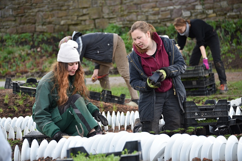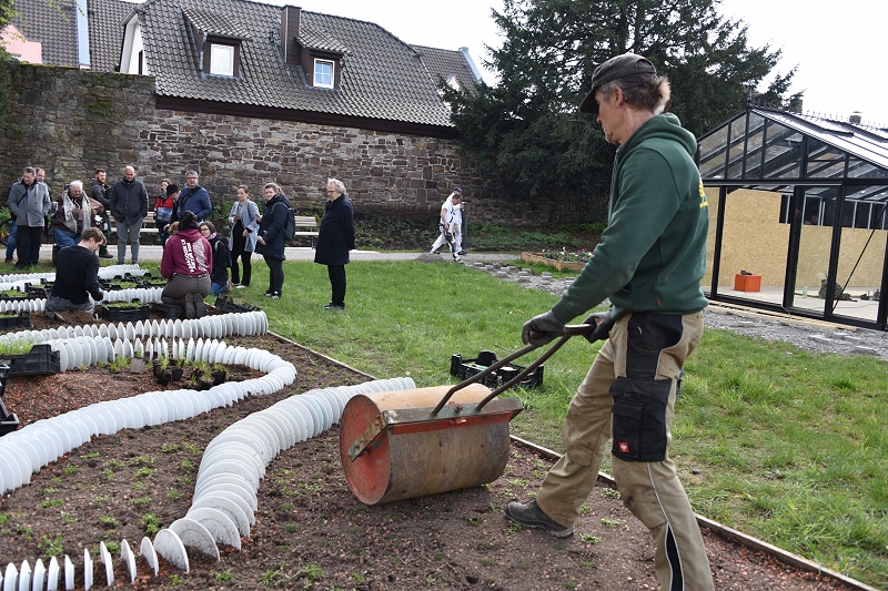Anderthalb Kilometer hat man bis hierhin schon hinter sich gelegt seit dem Eingangsportal am Remtergarten. Noch einmal 500 Meter sind es bis zum Schöpfungsgarten mit einem abgemauerten Teich mit herrlich blauem Wasser., wo auch Gottesdienste stattfinden sollen. Noch etwas weiter befindet sich die Landschaftsscholle mit bestem Weserblick. Der weitläufige Weg vom Wall bis nach Corvey ist zwar auch zu Fuß gut zu bestreiten, kann aber auch mit der „Bimmelbahn“, die in einem Rundkurs fahren und dabei an mehreren Stellen auf der Strecke halten wird, oder dem Dampfershuttle abgekürzt werden. Während im LGS-Bereich in Corvey überwiegend Blühwiesen vorhanden sind und Pflanzen, die sich am Wasser wohlfühlen gepflanzt wurden, so wie die Weserstauden oder die Taglilien, findet man an der Stadtmauer der Wallanlage Gewächse, die eher Schatten und Trockenheit bevorzugen. Außerdem befinden sich hier auch die Galeriegärten, die zeigen, wie modernes Gärtnern funktioniert. Sämtliche Beschilderungen fehlen noch und werden derzeit erstellt, erklärt Pressesprecherin Manuela Puls. Ein kleines Highlight, bevor man den Wall über das barrierefreie Drehkreuz wechselt in Richtung Nikolaischule, dass ist auch die aus 1600 Fürstenberg-Porzellantellern nachgebildete Landschaft des Weserberglandes. Die Idee dazu hatten die Studierenden der Technischen Hochschule OWL, die als letzte Maßnahme vor der Eröffnung die nachgebildete Landschaft mit speziellen Pflanzen begrünt haben. Die durch Jan Sommer geführte Rundtour endete am Lesegarten, am Hoffmann-Von-Fallersleben-Denkmal an der Corveyer Allee, wo die Steinmetze hinter dem Denkmal eine Ausstellungsfläche für moderne Grabsteine haben.