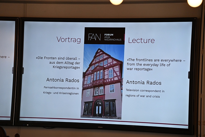 Warum begeben sich Fotografinnen und Fotografen ebenso wie Kriegsberichterstatter:innen in Krisengebiete, fragte sich Antonia Rados während ihrer Ansprache. Eine Antwort darauf könne sie jedoch nicht eindeutig nennen, sie betonte aber, wie bedeutend diese Arbeit an „vorderster Front“ für die Welt sei, um der Propaganda der Kriegsparteien etwas entgegen zu setzen. Kriegsberichterstatter und Fotografen in Konfliktsituationen seien „die Störenfriede der Propaganda“, weil sie neutral berichteten. Sie könnten die Welt zwar nicht ändern, aber für Zweifel an den Unwahrheiten der Propagandisten sorgen. Der Job, den sie selbst Jahrzehntelang für die Medien (darunter RTL) ausgeübt hat, sei riskant und anstrengend, aber das Risiko wert. Ein Bild eines Menschen aus Afghanistan von Anja Niedringhaus hat es Antonia Rados bei der anschließenden Besichtigung des Forums Anja Niedringhaus besonders angetan. Das Lachen dieses Menschen hat sie in ihren Bann gezogen - fasziniert von den Gesichtsausdrücken und von der Überzeugungskraft von Anja Niedringhaus, wie sie diese Menschen dazu bewegt hat, ein Foto von Ihnen machen zu dürfen.