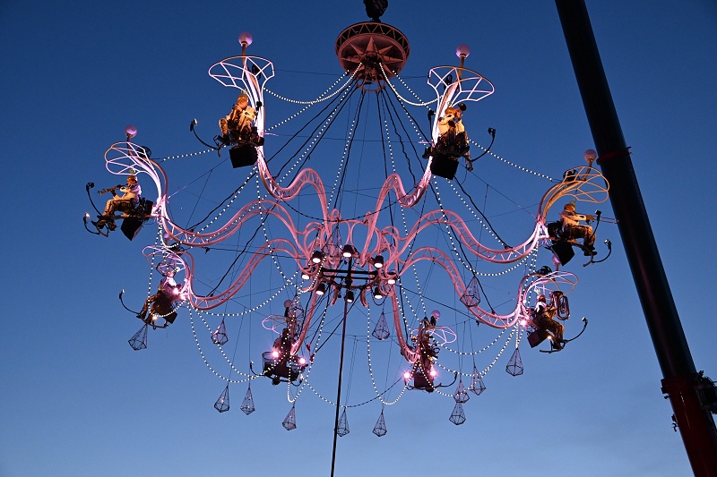 Höxter (TKu). „Was für eine magische Show!“ Sandra Böwer und ihr Mann Reimund aus Boffzen waren begeistert über die spektakuläre und aufsehenerregende Show „Cristal Place“ der französichen Künstlertruppe Compagnie Transe Express. Solch „hohe Kunst“ habe die Region bislang noch nicht gesehen, sagt Sandra Böwer. Gemeint ist das Orchester, das von einem großen Kronleuchter aus schwebend direkt über den Menschenmassen musiziert hat, dazu Artistinnen und Artisten, die Kunststücke in bis zu 40 Metern Höhe unter dem Leuchter vollbracht haben, während darunter auf der Bühne getanzt wurde. Drei Tonnen Gewicht hingen an dem Kranwagen eines regionalen Unternehmens aus dem Kreis Höxter. „Beim Kran ist eine dreifache Sicherheit gegeben“, sagte LGS-Geschäftsführerin Claudia Koch, die sich gefreut hat, das die Veranstaltung ausverkauft war. Mehr als 2500 Besucherinnen und Besucher waren dazu aus der gesamten Region auf das Landesgartenschau-Gelände nach Höxter geströmt, um die Artisten und Musiker aus Frankreich zu sehen, die nicht nur in ganz Europa, sondern in der gesamten Welt bereits hochkarätige Auftritte absolviert haben. Aber nicht nur Gucken, sondern Mitmachen zur Musik war angesagt im Publikum, wie auch auf der Bühne. Unter dem großen Kronleuchter in luftiger Höhe mit dem musizierenden Orchester darin, tanzten neben den Profis auch viele Besucherinnen und Besucher, die damit auch Teil eines riesigen Flashmobs wurden, angeheizt von der Musik, die später von DJ Marcus und Markus bei der After-Show-Party kam. 70 Minuten dauerte die fulminante Show, die von 28 professionellen Künstlerinnen und Künstlern sowie 16 lokalen Freiwilligen gestaltet wurden und die Teil des LGS-Kulturprogramms „Stadt Land Fluss- Luftikus“ ist. Die Compagnie Transe Express war als Auftaktveranstaltung der erste große Paukenschlag im umfangreichen Gartenschau-Kulturprogramm mit einer einmaliger historischer Kulisse von Schloss Corvey im Hintergrund des großen Kranwagens, an dem der Kronleuchter aufgehängt war.