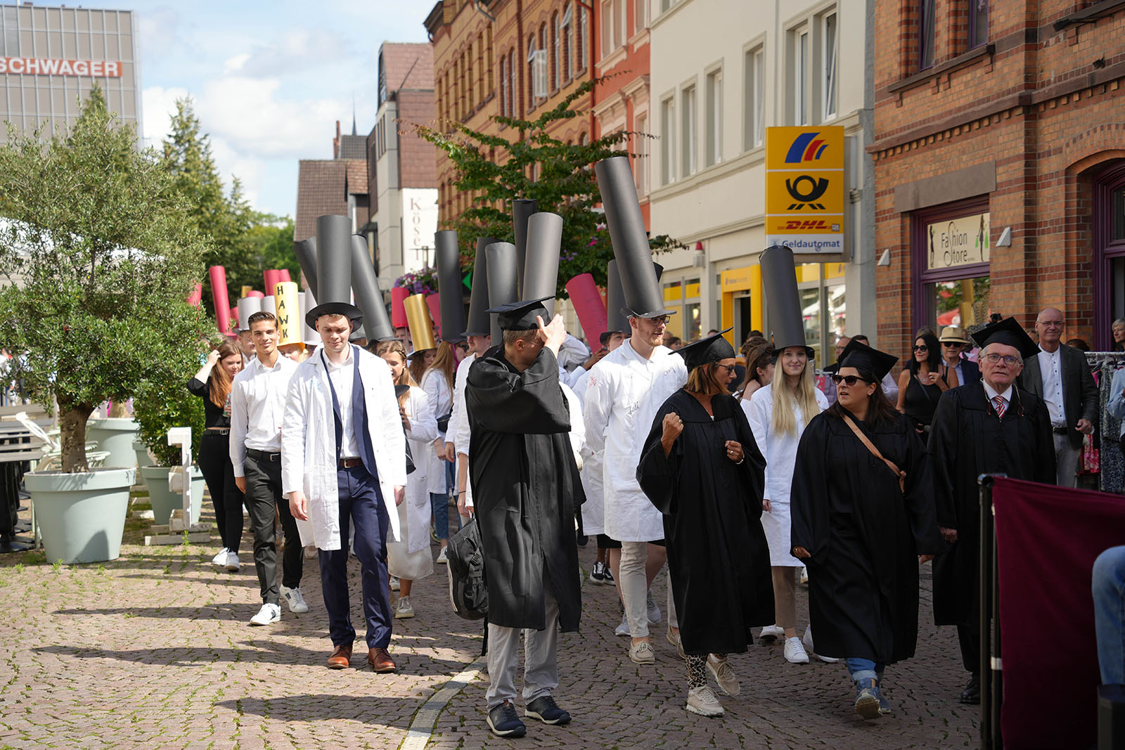 Abschließend folgte der traditionelle Meisterumzug durch die Innenstadt Holzmindens. Um Punkt 15 Uhr wurde zunächst das Glockenspiel am Reichspräsidentenhaus bewundert, ehe es dann zu der Weserbrücke ging. Doch davor musste ein Stopp am Biersalon Lion eingelegt werden, um die Kräfte mit einem Bier wieder aufzutanken. An der Brücke angekommen, erwarteten Freunde und Familie sehnsüchtig das „Hütewerfen“ in die Weser. Mit großem Applaus und Jubel zogen die Absolvierenden weiter zum Marktplatz, wo dann die Pooltaufe wartete. Freiwillig oder auch unfreiwillig warf man dann Absolventen, aber auch Professoren in zwei mit Wasser gefüllte Pools. Trocken blieb dabei kaum jemand. Am Abend folgte dann der Abschlussball im Lichthof.