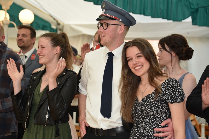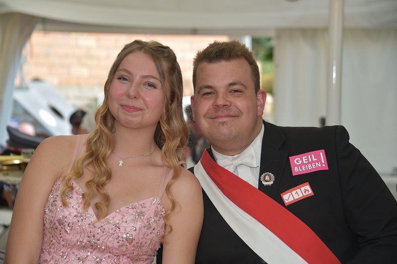 Unter großem Beifall marschierten am Abend die alten und neuen Majestäten in das Festzelt ein, begleitet von den eindrucksvollen Klängen des Spielmanns- und Fanfarenzuges Fürstenau. Mit einer etwa einstündigen Verspätung begann dort die feierliche Königsproklamation. Neben der Ehrung der neuen Könige wurden auch die alten Königspaare Sebastian und Silvia Balke sowie Niklas Stadermann und Mara Potthast würdig verabschiedet. Lothar Stadermann, der Vorsitzende der Schützengilde, verkündete die neuen Hofstaat-Mitglieder, die für eine Ortschaft dieser Größe bemerkenswert zahlreich sind.