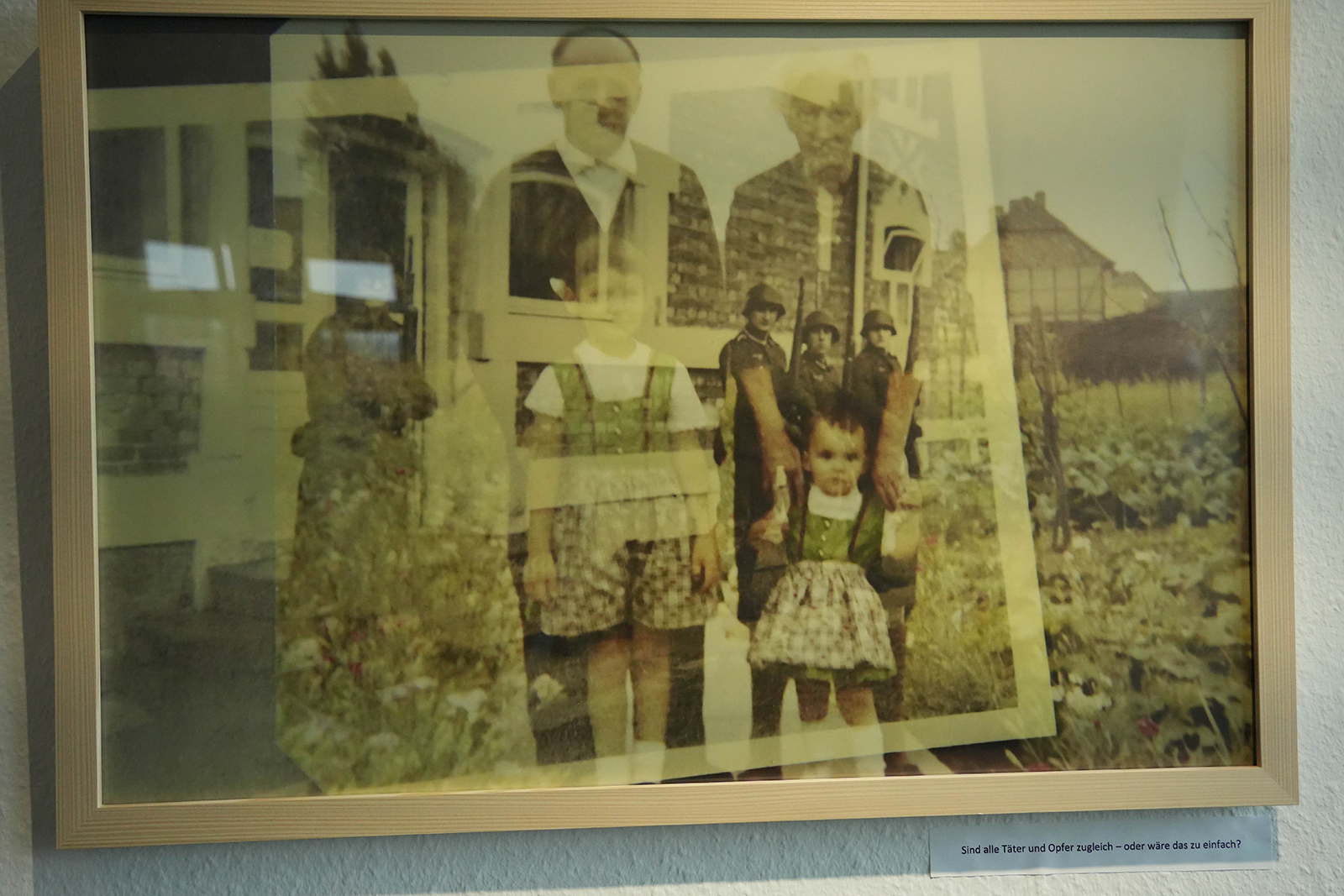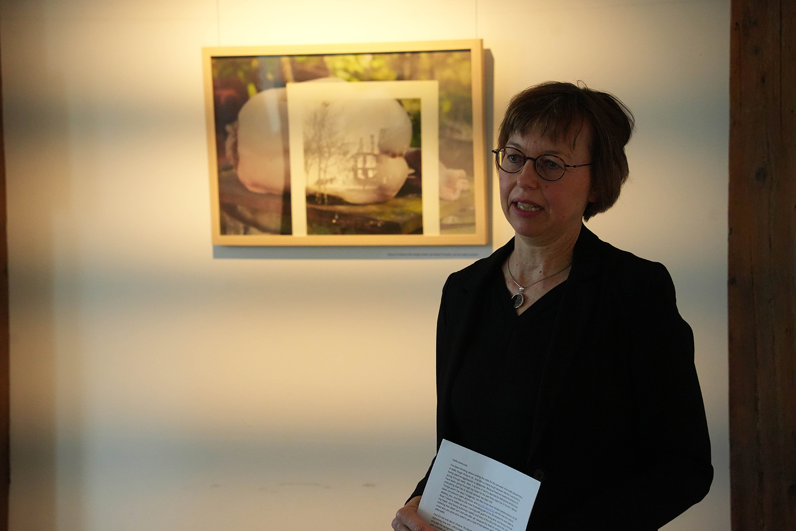 Lino Heisenberg, Kurator der Malerkapelle in Königslutter und Geschäftsführer des allgemeinen Konsumvereins, ging anschließend auf die Intentionen der drei Künstlerinnen ein und bezeichnete die Ausstellung als "keine schöne" und "düster": Sabina Kaluza, geboren in Polen, setzt sich in der Ausstellung mit zwei Stelen mit ihrer Familiengeschichte auseinander. Ihre zwei Großväter waren Opfer und Täter im zweiten Weltkrieg. Der eine starb im Konzentrationslager, der andere kämpfe als Soldat der deutschen Wehrmacht.