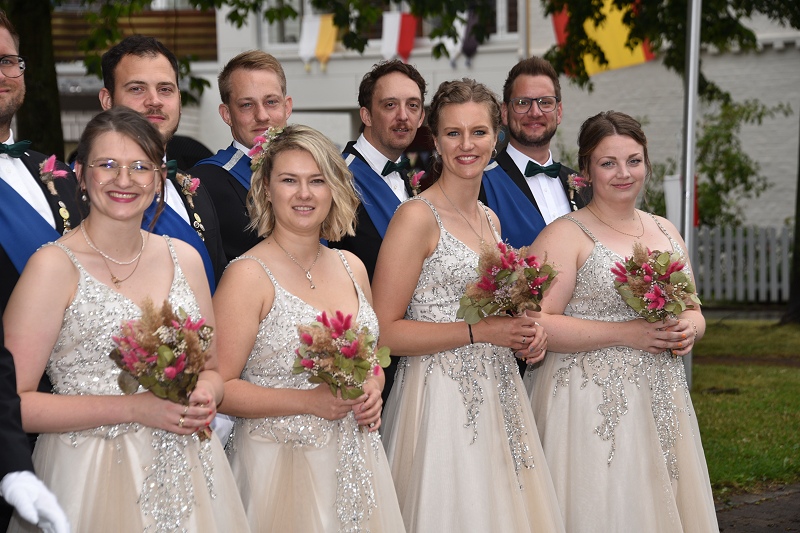 Lüchtringen (TKu). Es war der große Festhöhepunkt der beiden Lüchtringer Schützenkönigspaare Bernd und Christiane Heukrodt (Altkönigspaar) sowie Sven ujnd Kira Schafer (Jungkönigspaar) nebst Hofstaaten sein. Dauerregen trübte jedoch die Feststimmung ein wenig. Doch passend zum großen Festumzug verbesserte sich die Wetterlage schlagartig. Der für 14 Uhr geplante Festumzug sollte zunächst ausfallen. In den Westfalenstuben in Lüchtringen trafen sich der Vorstand und die Majestäten der Schützenbruderschaft St. Johannes Lüchtringen von 1573 e.V. eine halbe Stunde vor Umzugsbeginn zu einer Krisensitzung, bei dem die Wetterlage genauestens verfolgt wurde. Von dem anfangs schlechten Wetter ließen sich die Organisatoren und Teilnehmer nicht entmutigen. Als das Regenband durchgezogen war, fand der Umzug mit einer dreiviertel Stunde Verzögerung statt. Mit dabei waren die Schützengilden und -vereine aus Alben, Höxter, Holzminden, Stahle und Wehrden zusammen mit ihren Königspaaren und Hofstaaten.