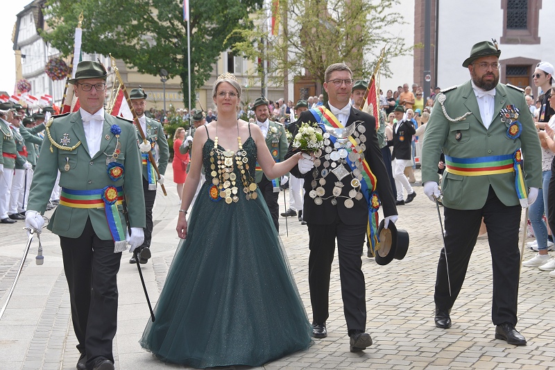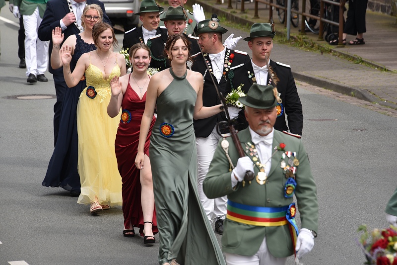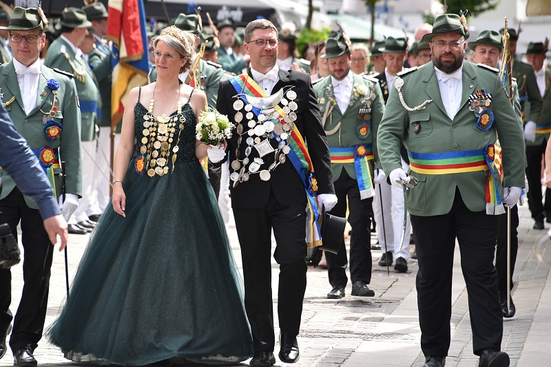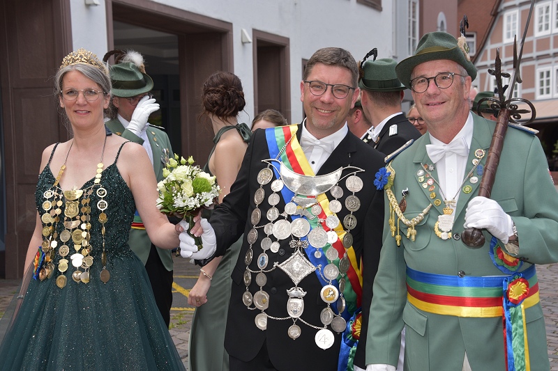 Höxter (TKu). Nach der Proklamation des neuen Höxteraner Königspaares Lars und Judith Jubitz am Montagmorgen, ging es am Nachmittag zum ersten Mal in den großen Schützenumzug. Schützenfest kennt in der Zeit des Festes kein Anfang und kein Ende, denn bis es soweit war, geschah noch so einiges vor dem Ausmarsch aus dem Festzelt: Am Montagmorgen wurde nach dem traditionellen Schützenfrühstück auch der Jugendpokal für die besten jungen Schützen verliehen. Hannes Weißbänder (1. Kompanie) errang dabei Platz eins, gefolgt von Bjarne Rampe (4. Kompanie) auf dem zweiten Platz sowie Jan Niklas Hüttig (2. Kompanie) auf dem dritten und Lukas Kamp (3. Kompanie) auf dem vierten Platz. Ebenfalls übergeben wurden die von Dieter Kuhlebrock gestifteten Ehrenscheiben an die besten Schützen der vier Kompanien. Die mit dem historischen Höxteraner Stadtwappen vom Kaminofen im Historischen Rathaus bemalten Scheiben erhielten: Mario Ritzenhoff (1. Kompanie), Tim Gießmann (2. Kompanie), Peter Lohmann (3. Kompanie) und Andreas Waßmuth (4. Kompanie). Am Nachmittag setzte sich ein Festumzug mit dem neuen Königspaar, dessen Hofstaat und den vier Schützenkompanien samt Gastvereinen durch die Stadt in Bewegung.