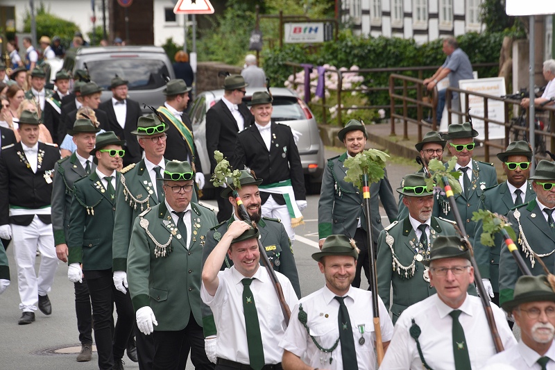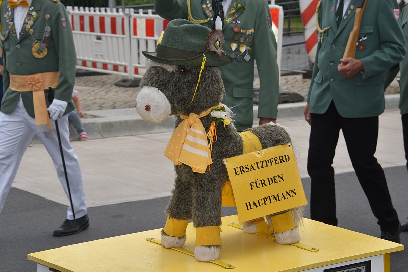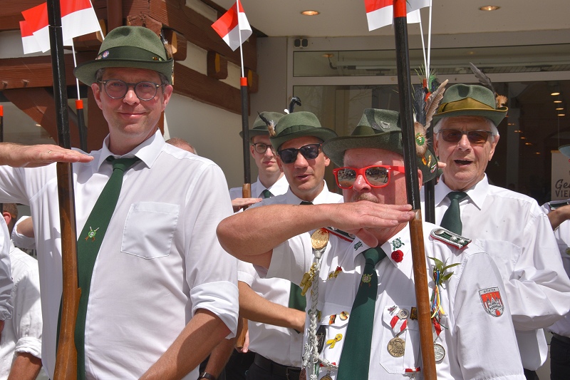 Mittendrin statt nur dabei war das neue Königspaar Lars und Judith Jubitz – er in Grün und sie auch mit einem dunkelgrünen Kleid in der Farbe der neuen Königskompanie „Die Zwote“. In Höxter schien der Montag ein Feiertag zu sein, denn bejubelt wurde das Königspaar auch am Montag in der Innenstadt wieder von vielen Hundert Menschen an den Straßenrändern. Auch an beiden großen Seniorenheimen St. Nikolai und am Konrad-Beckhaus-Heim führte der Umzug wieder vorbei. Viele Seniorinnen und Senioren warteten bereits gespannt auf das Königspaar, das sich nach dem Eintreffen aus der Kutsche erhob, um die Zuschauerinnen und Zuschauern mit einem königlichen Winken zu grüßen. Die Senioren hingegen hatten bereits „umgeschwenkt“ von der blauen Königsfahne am Sonntag auf die grüne Version. Mit einem Vorbeimarsch an der Nikolaikirche erwiesen die Schützen dem Königspaar die Ehre. Und wieder wurde an dieser Stelle klar, dass es ein mehrere hundert Meter langer Umzug war - auch in der „abgespeckten“ Variante. Ebenfalls mit im Umzug dabei war diesmal auch ein historischer Mercedes-Pritschenwagen aus dem Jahr 1959 mit der großen Aufschrift: „Lebe Deinen Traum“, der von der zweiten Kompanie organisiert worden war und mit dem die „Zwote“ ihrem Königspaar einen besonderen Gruß senden wollte – am Steuer: der ehemalige Hauptmann der zweiten Kompanie, Dietmar Beineke. Das die zweite Kompanie die neue Königskompanie ist, das war in der Innenstadt am Montag nicht zu übersehen, denn die Alltagsmenschen trugen allesamt grüne Mützen.