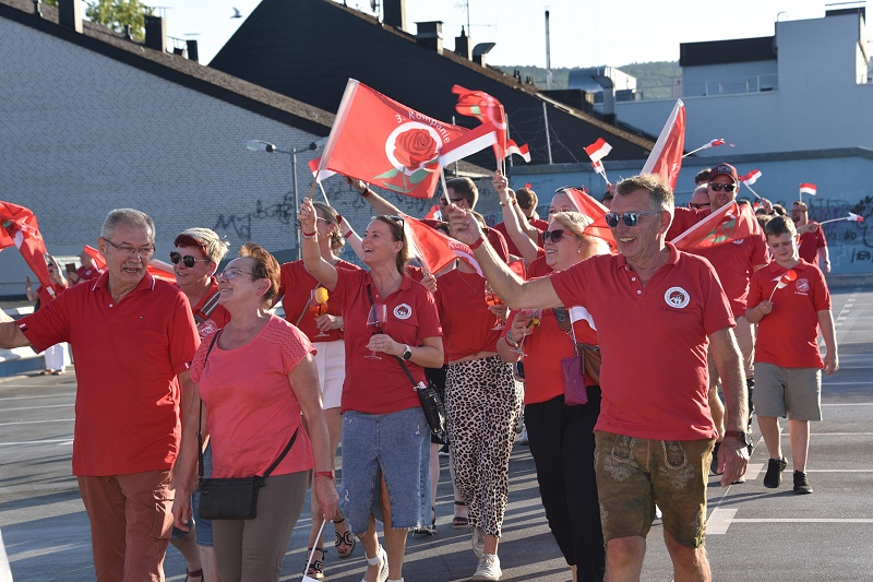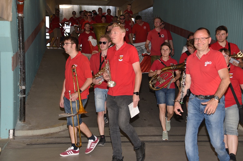 Höxter (TKu). So schön kann ein Schützenfest zu Ende gehen: Die dritte Kompanie der Schützengilde Höxter von 1595 e.V. ist mit Blasmusik und den Familienangehörigen von 0 bis 90 Jahren bei ihrer Schützenfest-Abschlussveranstaltung über alle Decks durchs Parkhaus in der Bachstraße marschiert. Und so färbte sich das Parkhaus durch die mehr als 100 Teilnehmenden in der Kompaniefarbe Rot. Bei diesem traditionellen Marsch erklang neben dem Weserlied auch immer wieder das Kompanielied „Oh Heideröslein“. Vorbei am Kompanielokal „Bürgerstuben“ wurden „Die Roten“, von „Den Gelben“ am Straßenrand begrüßt - der vierten Kompanie der Schützengilde. Der Umzug führte danach weiter durch die Innenstadt, wo Bürgermeister Daniel Hartmann überraschend dazu stieß. Er war gerade mit der internationalen Kommission „Entente Florale“ im Hotel Niedersachsen und hatte das Singen der dritten Kompanie gehört. Spontan überredete der Bürgermeister den Hauptmann Frank Lohmann und Spieß Thomas Spieker, die eigentliche Marschroute zu ändern und die vor dem Hotel Niedersachsen befindliche internationale Kommission mit dem „Heideröslein“ zu begeistern. Und die Jury war überrascht und begeistert, wie textsicher doch alle waren.