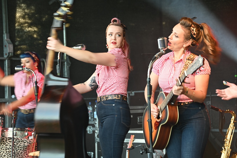 Die Silverettes, bestehend aus Ira, Jane und Honey, stammen aus Ostwestfalen und dem Ruhrgebiet und sie glänzten mit einer Mischung aus eigenen Songs und einzigartigen Interpretationen bekannter Hits, darunter „Dynamite“ von BTS und Klassiker wie „Sweet Dreams“. Als Vorband waren sie bereits für die Musiker und Bands „Dick Brave & The Backbeats“ oder „The BossHoss“ im Einsatz. Mit knallroten Lippen, Polka Dots und jeder Menge Charme brachten sie die Weserscholle zum Beben und versetzten das Publikum in einen regelrechten Rockabilly-Rausch auf der malerischen Weserscholle. „Was für ein genialer Ausblick auf den Weserfluss“, hieß es von den Silverettes auf der Bühne, die von Höxter und der Landschaft drumherum sehr angetan waren. Dieser Rock’n’Roll-Abend voller nostalgischer Klänge wird den Besucherinnen und Besuchern sicherlich noch lange in Erinnerung bleiben wird.