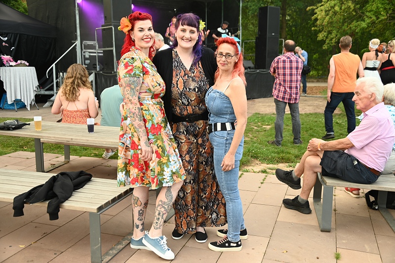 Höxter (TKu). Rockabilly an der Weser – ein Abend zum Genießen: Am vergangenen Samstagabend verwandelte sich die Weserscholle im Huxarium Gartenpark Höxter in eine pulsierende Rockabilly-Bühne. Die Band „The Silverettes“ heizte den rund 150 Besucherinnen und Besuchern ordentlich ein und bot eine mitreißende Show, die das Lebensgefühl der 50er Jahre perfekt einfing. Mittendrin statt nur dabei im Geschehen waren die Höxteranerinnen Michaela Rook, Svenja Walter, Melanie Lappe und Yvonne Schaper, die im stilechten Rockabilly-Outfit den Abend genossen. Die vier Damen sind echte Fans dieser Musik und lassen nach eigener Aussage zufolge keine solcher Veranstaltungen in der näheren Umgebung aus, wie sie erklären.
