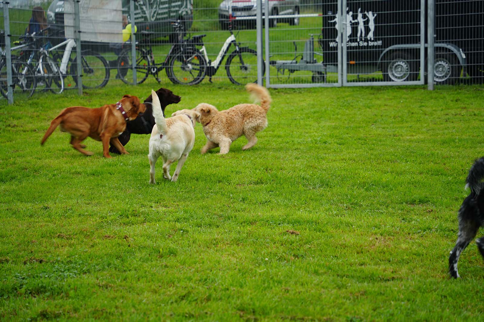 Auch wenn sich das Wetter nicht von seiner besten Seite zeigte, ließen sich Hund und Mensch die Laune nicht verderben. Als das Band, das von Tunke und dem stellvertretenden Gemeindedirektor, Philip Becker, gehalten wurde, von Raßmann durchschnitten wurde, stürmten rund 20 Hunde auf die Wiese und zeigten, wie viel Power in ihnen steckt. Es wurde hinterhergejagt, gebellt, gehüpft und sich auf dem Boden gewälzt – sehr zur Freude von Frauchen und Herrchen.