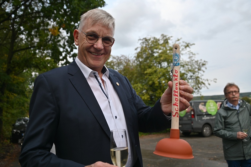 Höxter (TKu). Ein idyllisches Örtchen an einem idyllischen Platz: Nach nur zweieinhalb Monaten Bauzeit ist das „Schollenklo“ auf der Weserscholle in Höxter fertiggestellt und nun übergeben worden. Der Freundeskreis Corveyer Dynamiker (FCD) übergab am vergangenen Donnerstag feierlich das neu errichtete Toilettenhaus, das auf den Namen „Schollenklo“ getauft wurde, an Bürgermeister Daniel Hartmann. Mit einem Augenzwinkern und einem symbolischen Klostampfer als Schlüssel überreichte der Vorsitzende des FCD, Ulrich Menne, das Gebäude offiziell in die Obhut der Stadt im Beisein von mehr als 30 Gästen. „Das Schollenklo ist nicht einfach nur ein öffentliches WC. Es steht als Symbol für bürgerliches Engagement und die Zusammenarbeit der örtlichen Handwerker und Unterstützer. Mit Stolz können wir sagen, dass wir gemeinsam etwas geschaffen haben, das mehr Lebensqualität für unsere Besucher und alle Höxteraner bringt“, sagte Ulrich Menne in seiner Ansprache. Die geschätzten Baukosten von 180.000 bis 200.000 Euro wurden vollständig durch Spenden und ehrenamtliche Arbeit finanziert.