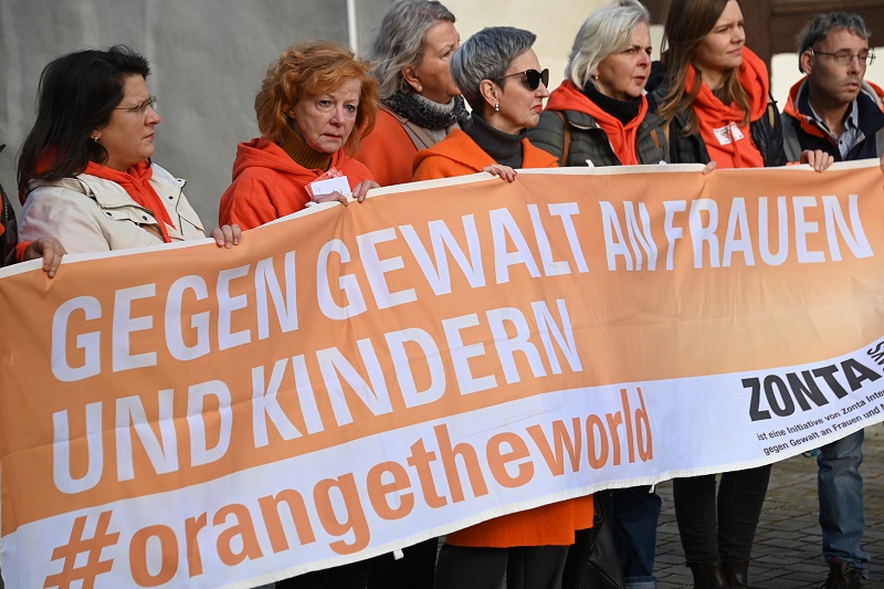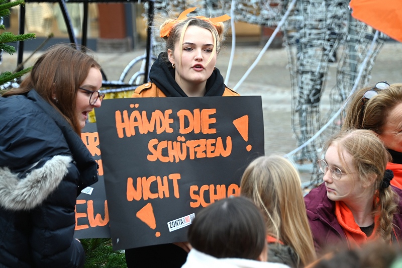 Höxter (TKu). Am Montagmittag setzte der Zonta-Club Höxter zusammen mit Schülerinnen und Schülern des Berufskollegs des Kreises Höxter und weiteren Unterstützern mit einer eindrucksvollen Veranstaltung vor der Dechanei ein klares Zeichen gegen Gewalt an Frauen und Kindern. Im Rahmen der weltweiten Kampagne „Orange the World“ kamen starke Stimmen zu Wort und brachten das Thema mit eindringlichen Appellen und kreativen Aktionen in den Fokus der Öffentlichkeit. Die Präsidentin des Zonta-Clubs, Leonore von Falkenhausen, eröffnete die Kundgebung und betonte, wie wichtig es sei, die Stimme gegen Gewalt zu erheben. „Frauen mit starken Stimmen“ sprachen anschließend über die Dringlichkeit, das Thema aus der gesellschaftlichen Tabuzone zu holen.