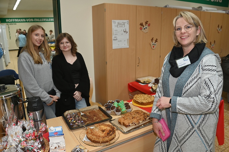 Höxter (TKu). Die Hoffmann-von-Fallersleben-Realschule öffnete am Wochenende erneut ihre Türen für den beliebten Hoffmanns-Markt, der einmal mehr zahlreiche Besucherinnen und Besucher anlockte. Eltern, Lehrer, Schüler und Interessierte strömten in die Schule, um die vielfältigen Angebote zu genießen, die Schulgemeinschaft näher kennenzulernen und gleichzeitig Gutes zu tun. Schon beim Betreten des Schulfoyers wurden die Gäste von einer lebendigen Atmosphäre empfangen. Verkaufsstände mit liebevoll selbstgebastelten Deko-Artikeln und kulinarischen Leckereien boten etwas für jeden Geschmack. Parallel dazu präsentierten verschiedene Schülergruppen diverse Projekte: Die Sporthelfer und Kulturscouts gewährten Einblicke in ihre engagierte Arbeit, es wurde gebacken, gebastelt, Erste Hilfe demonstriert und es gab viele viele weitere Projekte, die von den Schülerinnen und Schüler vorgestellt wurden. Während die Schülerband im Foyer ihr Können unter Beweis stellte, sorgten Feuerschalen und dutzende Kerzen auf dem Schulhof für eine gemütliche vorweihnachtliche Atmosphäre.