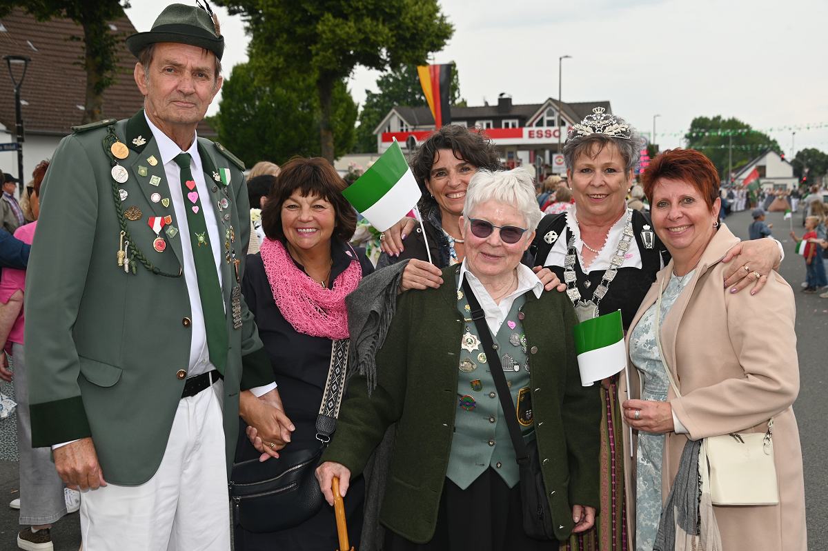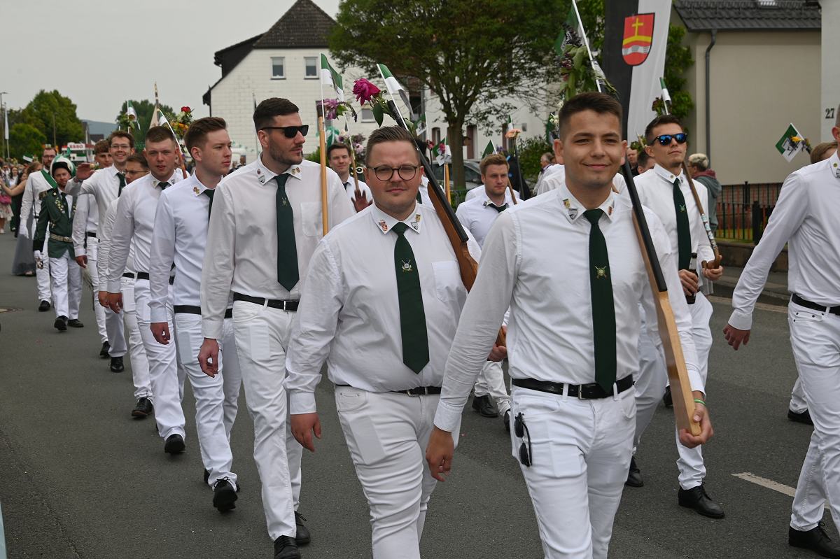 Stahle (TKu). Trotz wechselhaften Wetters hat die Schützengesellschaft Stahle von 1575 e. V. ihr 450-jähriges Jubiläum mit einem beeindruckenden Jubiläumsfest gefeiert. Zwar fiel der große Festumzug am Pfingstsonntag sprichwörtlich ins Wasser, heftige Regenschauer haben einen großen Festumzug nicht möglich gemacht, doch das tat der Feierlaune keinen Abbruch. Ab Montag legte Stahle dann richtig los und da gaben die Frauen den Ton an. Bei besserem Wetter am Pfingstmontagvormittag bestimmten die Frauen das Bild im Festumzug: Traditionell zogen hunderte Stahlerinnen mit Bowle und bester Laune durch den Ort und bildeten eine jubelnde und farbenfrohe Meute, die für ausgelassene Stimmung sorgte. Pünktlich zum Start des Festumzugs, um die beiden Königspaare standesgemäß abzuholen, besserte sich das Wetter. Die Königsparade für das Jungkönigspaar René Ahrend und Adriana Schwiete fand auf der Corveyer Straße statt. Für das Altkönigspaar Wladimir und Ida Schmidt ging es rauf auf den Berg: In Begleitung hunderter Schützinnen und Schützen aus Stahle und von den benachbarten Vereinen zog der Umzug durch den Ort bis zum Feldberg, wo traditionell die Königsparade abgehalten wurde.
