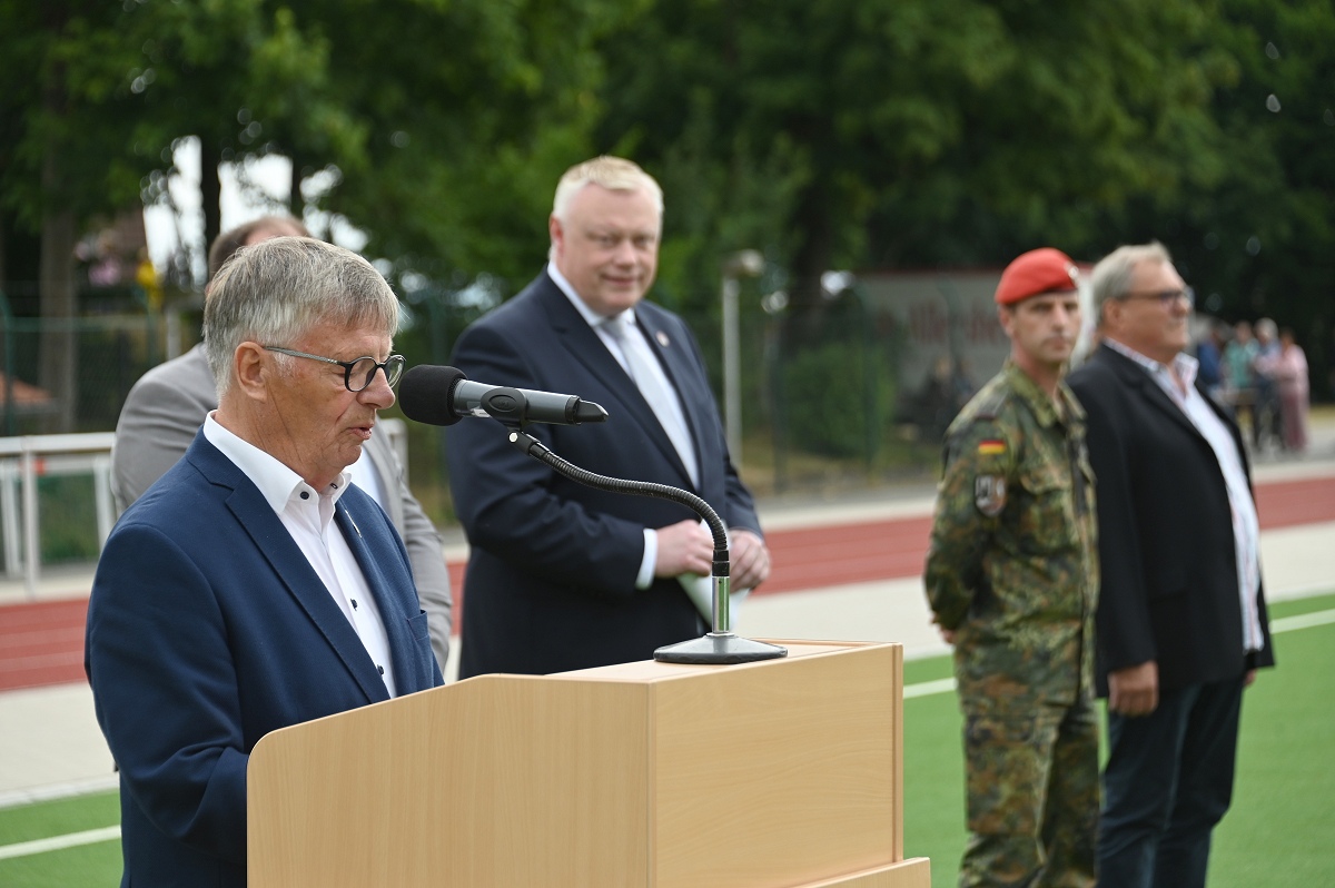 Ortsausschussvorsitzender Günther Fricke warf einen bewegenden Blick zurück auf die Anfänge der Verbindung. Er erinnerte an den verstorbenen Hauptmann der Reserve, Jürgen Dähling, und den ersten Kompaniechef Günther Bender, die 1995 gemeinsam mit engagierten Bürgern den Grundstein für die Patenschaft legten. „Diese Brücke zwischen Dorf und Bundeswehr war und ist stabil – getragen von Begegnungen, gegenseitigem Interesse und tiefem Respekt.“