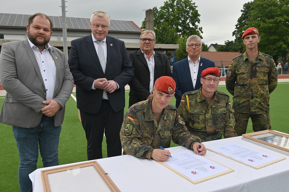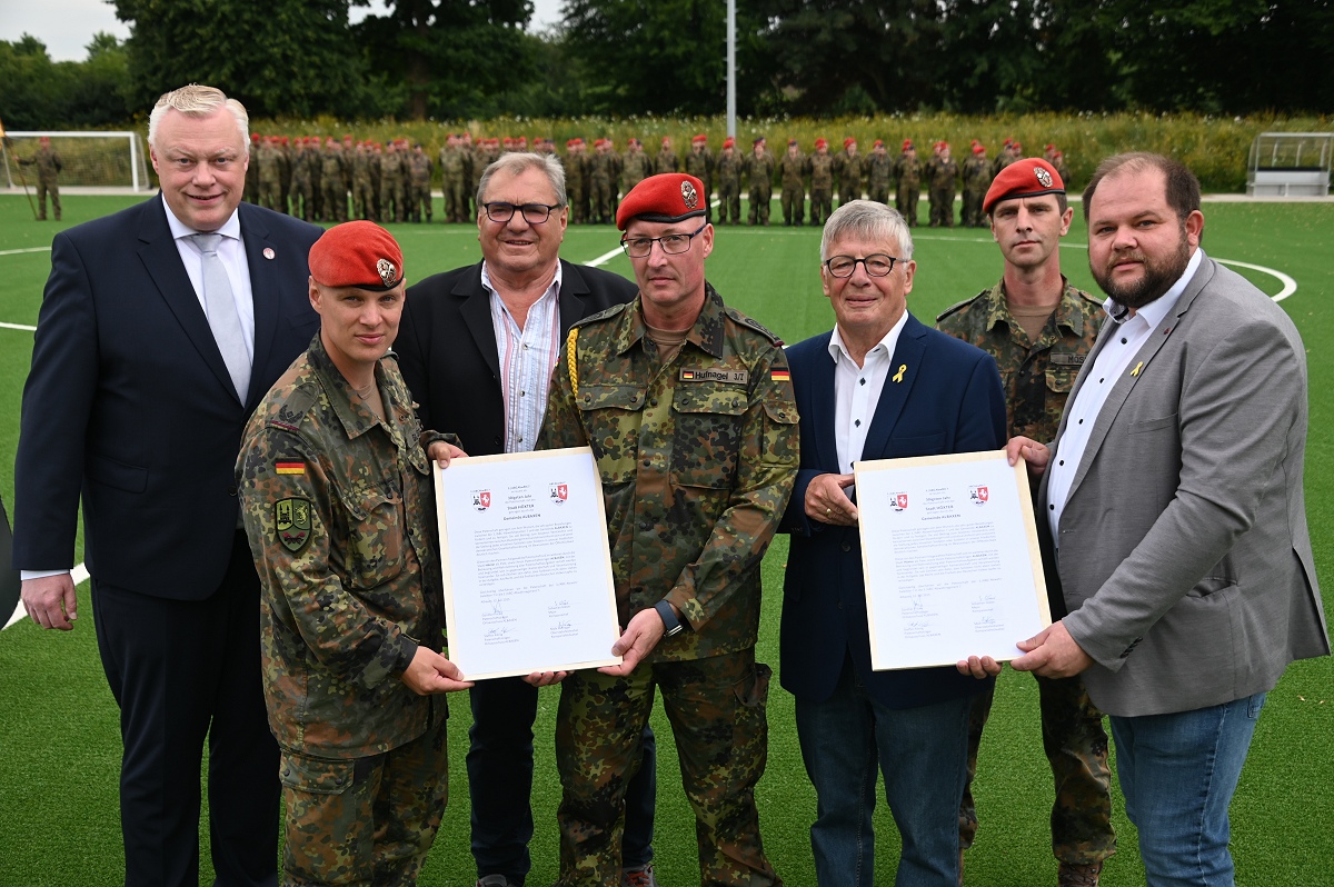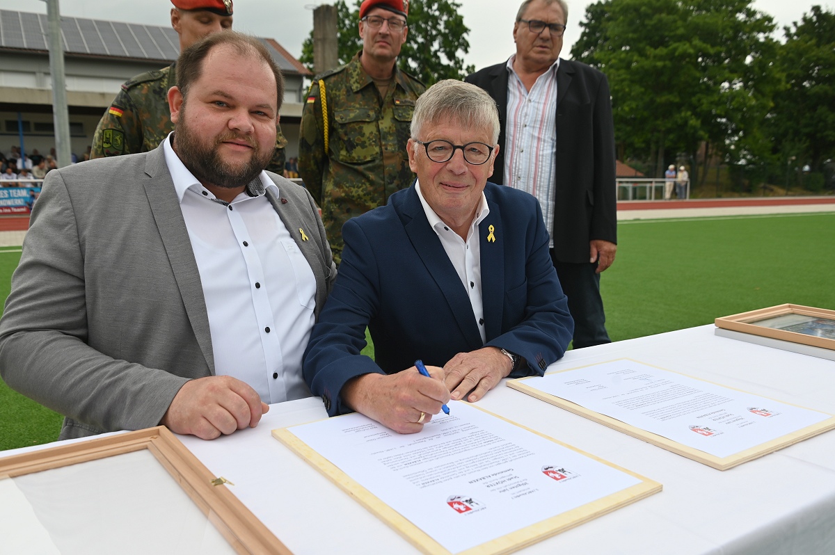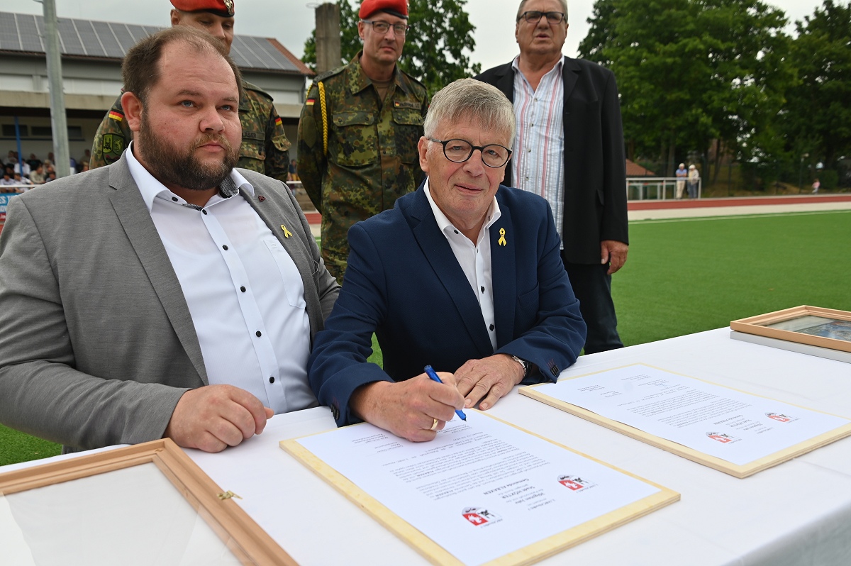 Im Rahmen des Appells wurden die Patenschaftsurkunden von 1995 feierlich erneut überreicht – angepasst an die neue Struktur der Einheit, die inzwischen als Regiment firmiert. Die aktualisierten Dokumente unterzeichneten Günther Fricke und Steffen König für den Ortsausschuss sowie Kompaniefeldwebel Maik Hufnagel und Kompaniechef Major Sebastian Gläser für die Bundeswehr.