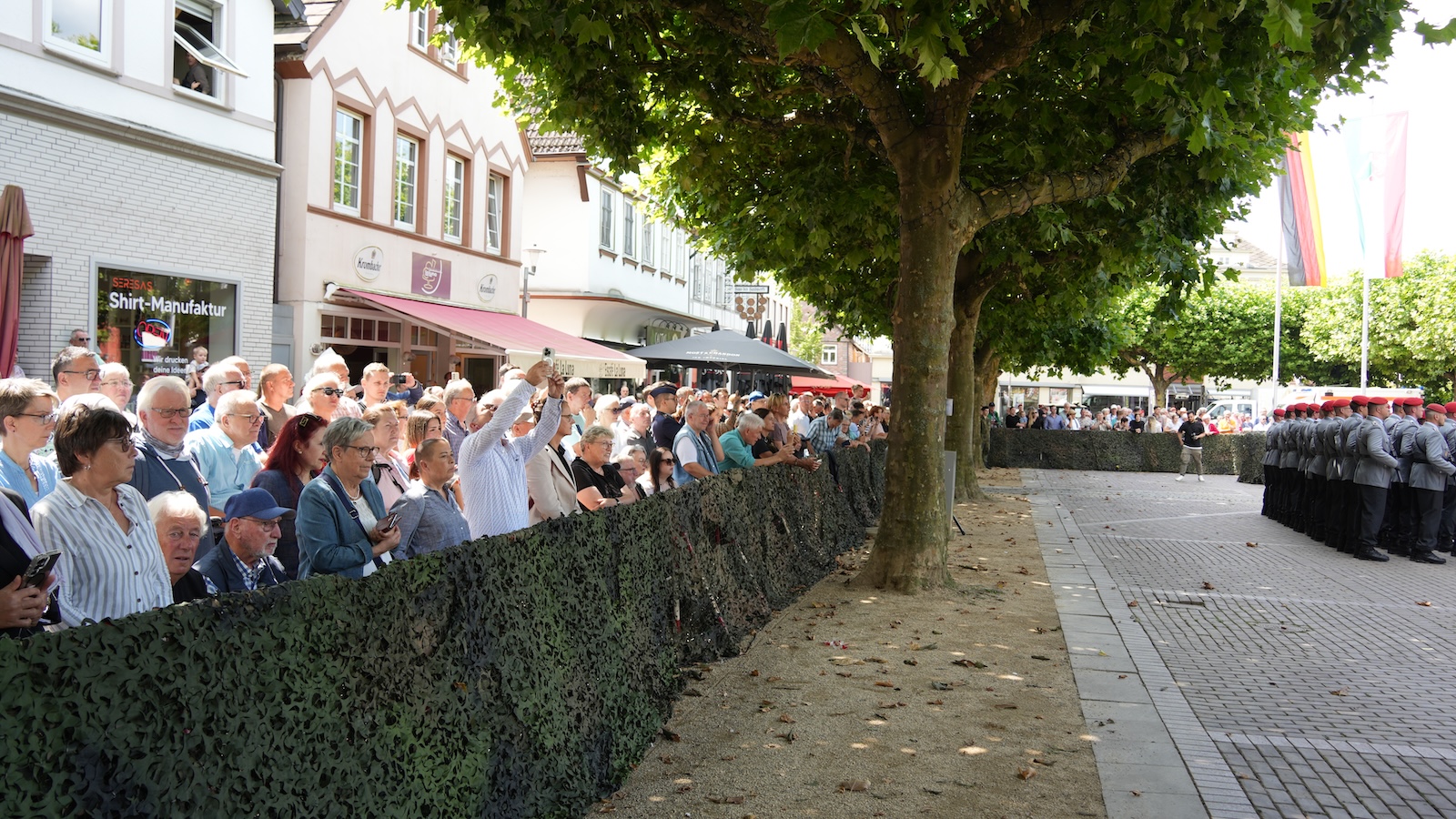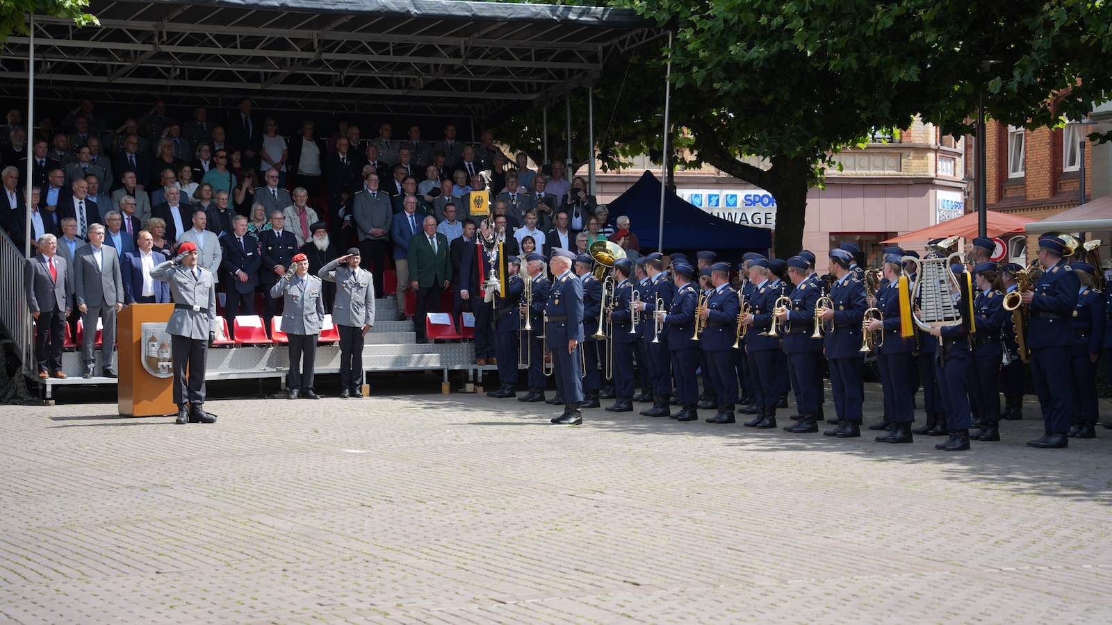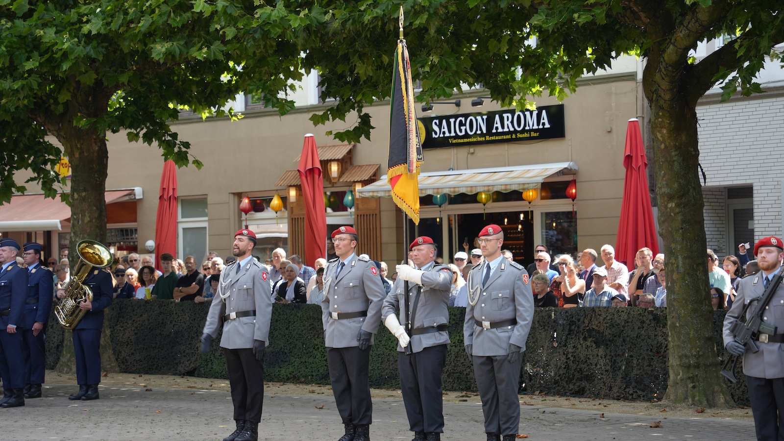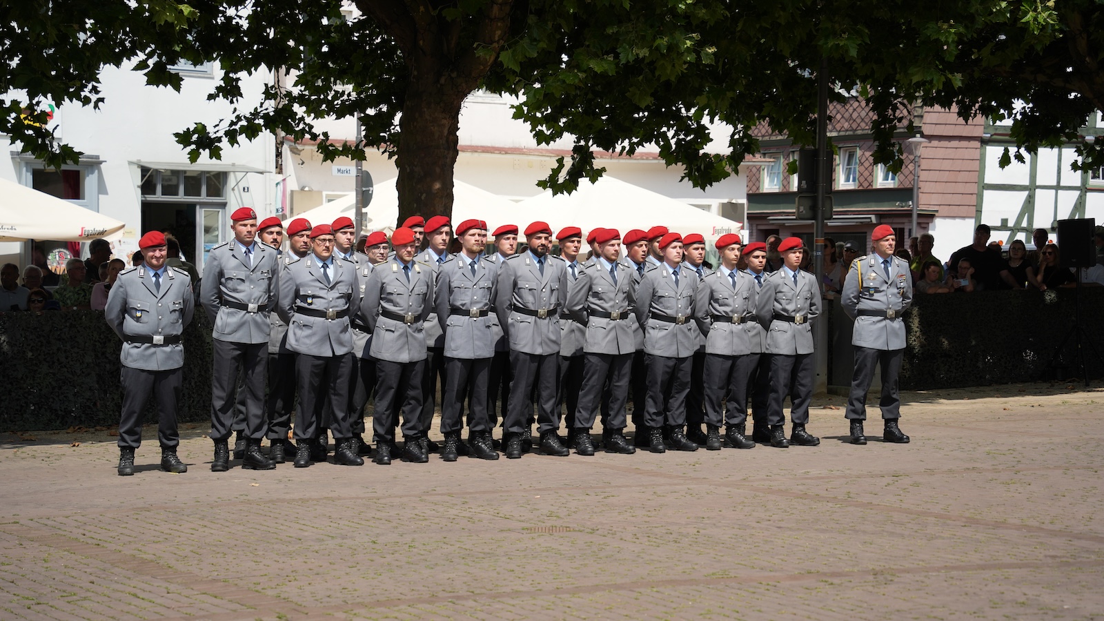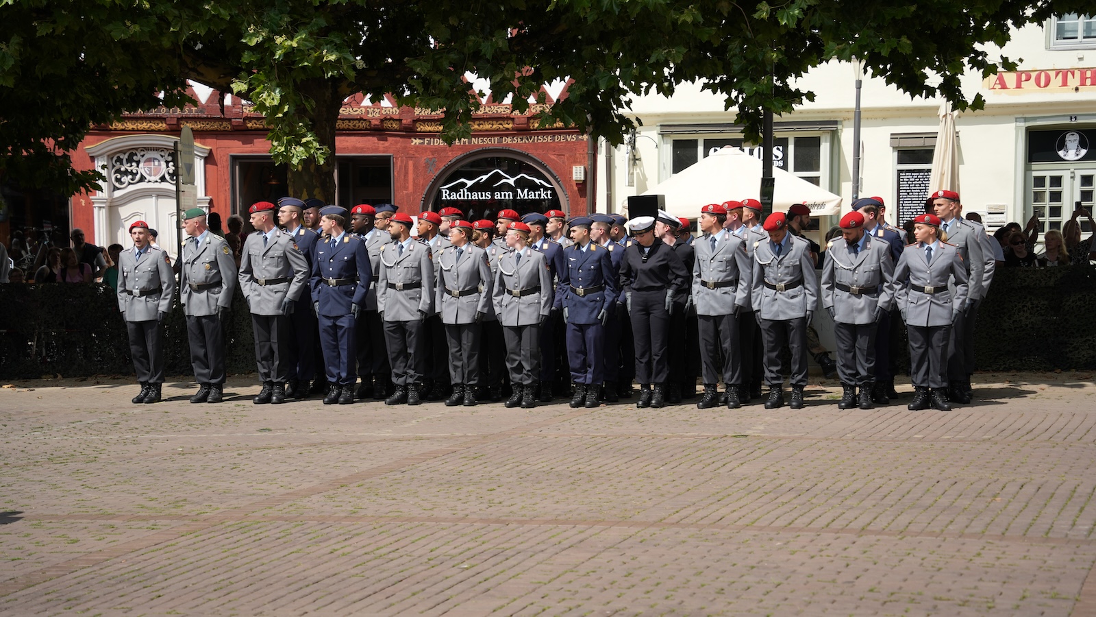 Bei der Zeremonie wechselten sich Redebeiträge und musikalische Einlagen der Bundeswehr-Blaskapelle ab. Das altniederländische Dankgebet und die deutsche Nationalhymne erklangen über den ganzen Marktplatz. Die jungen Soldatinnen und Soldaten standen diszipliniert in ihrer Formation und folgten den Kommandos: „Stillgestanden!“, „Zur Meldung – Augen rechts!“ und „Rührt euch!“ – Befehle, die dem Publikum einen Einblick in die gelebte Disziplin der Truppe gewährten.