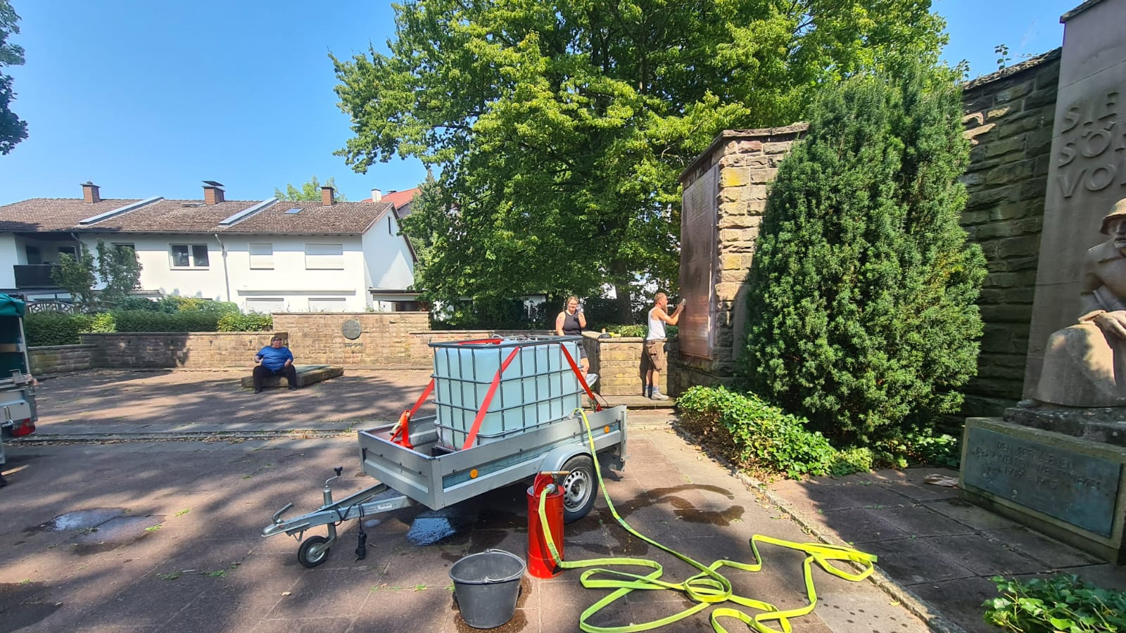 Innerhalb weniger Stunden befreiten die Helfer Tafeln, Inschriften und die Statue von Moosen und Flechten. Mithilfe von Bürsten, Schwämmen und speziellen Reinigungsgeräten konnten die Oberflächen wieder sichtbar gemacht und aufgefrischt werden. Unterstützt wurden die Arbeiten von der Werksfeuerwehr Stiebel Eltron, die Wasser und Geräte bereitstellte.