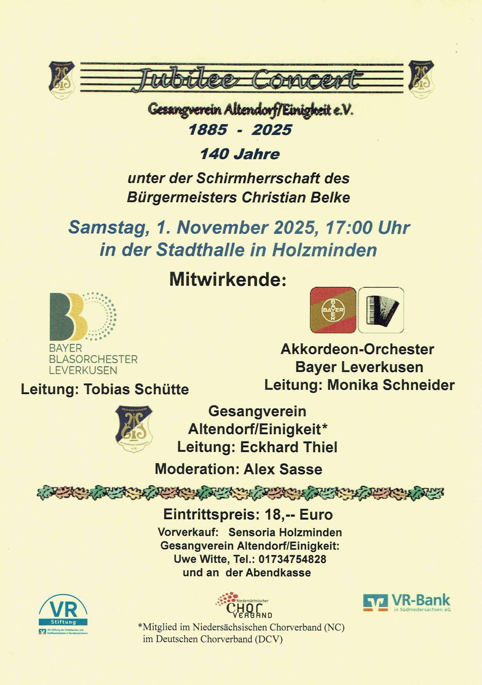 Die Verbindung zwischen dem Gesangverein Altendorf/Einigkeit und den beiden Orchestern besteht seit mehreren Jahrzehnten – ein Band der Freundschaft, das dieses einmalige Konzert möglich macht. Das Bayer Blasorchester Leverkusen, gegründet 1901 und damit das älteste kulturelle Ensemble der Bayer AG, hat sich in den vergangenen 25 Jahren zu einem sinfonischen Blasorchester auf Spitzenniveau entwickelt. Rund 65 Musikerinnen und Musiker präsentieren ein breites Repertoire von sinfonischen Originalkompositionen bis hin zu Musical- und Filmmusik. Unter der Leitung von Tobias Schütte erreichte das Ensemble zuletzt beim World Music Festival den dritten Platz.