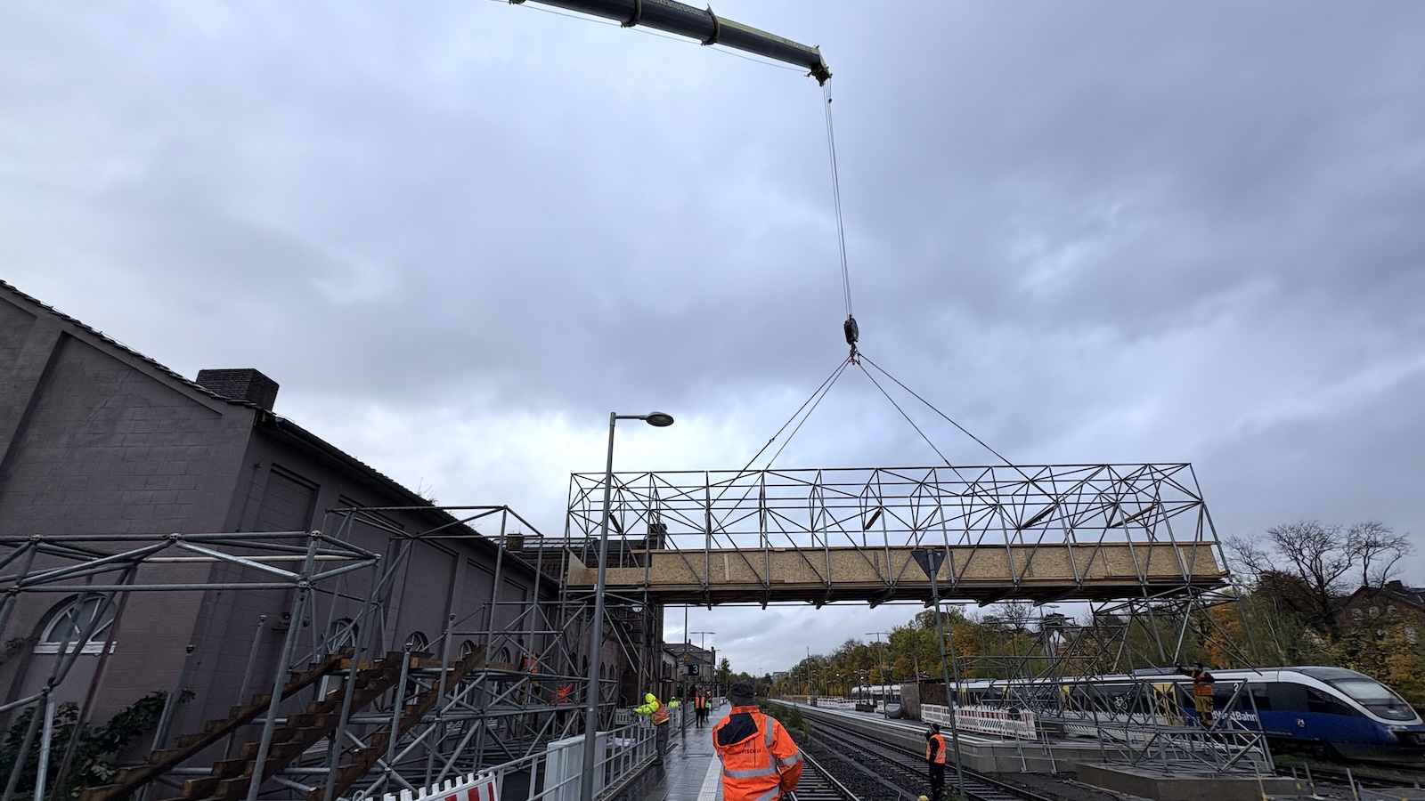 Holzminden (lbr). Am Montagmorgen war am Bahnhof Holzminden erneut schweres Gerät im Einsatz: Mit einem riesigen Autokran wurde eine provisorische Fußgängerbrücke über die Bahngleise gehoben. Sie ermöglicht während der laufenden Bauarbeiten den Zugang zu Gleis 3 und bleibt bestehen, bis die Personenunterführung vollständig modernisiert und wieder nutzbar ist.
