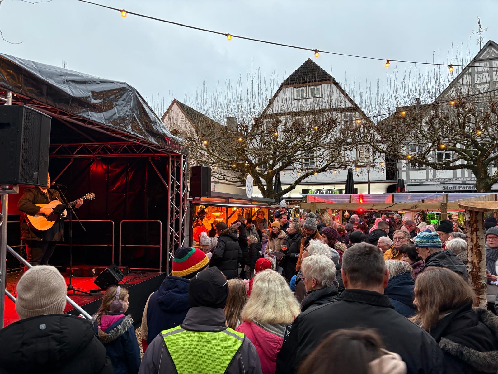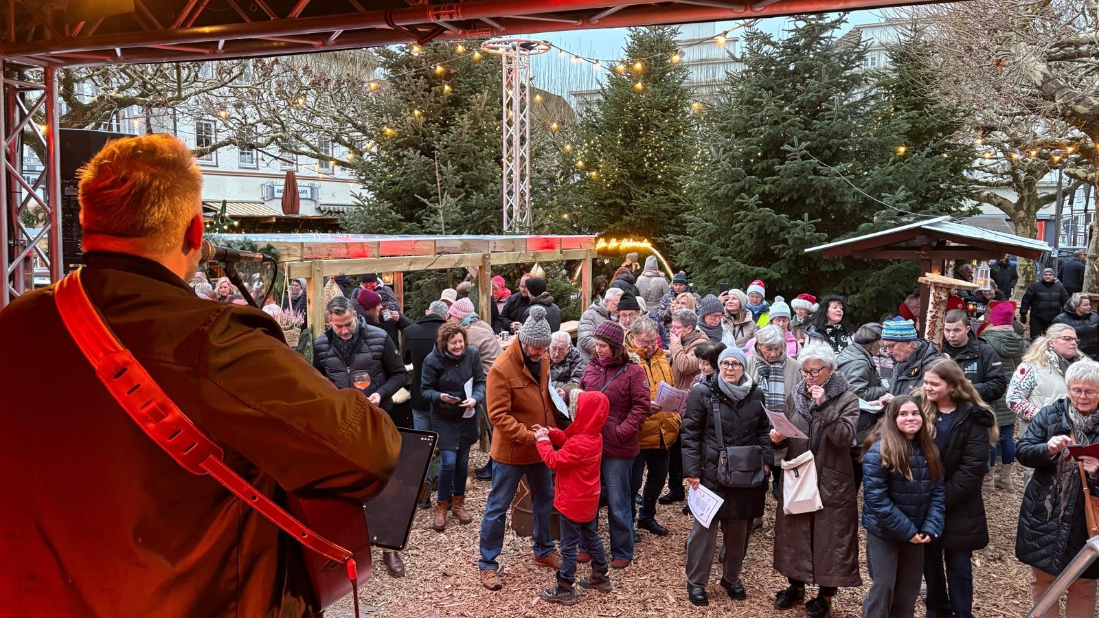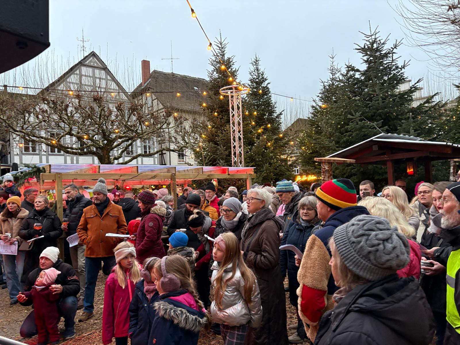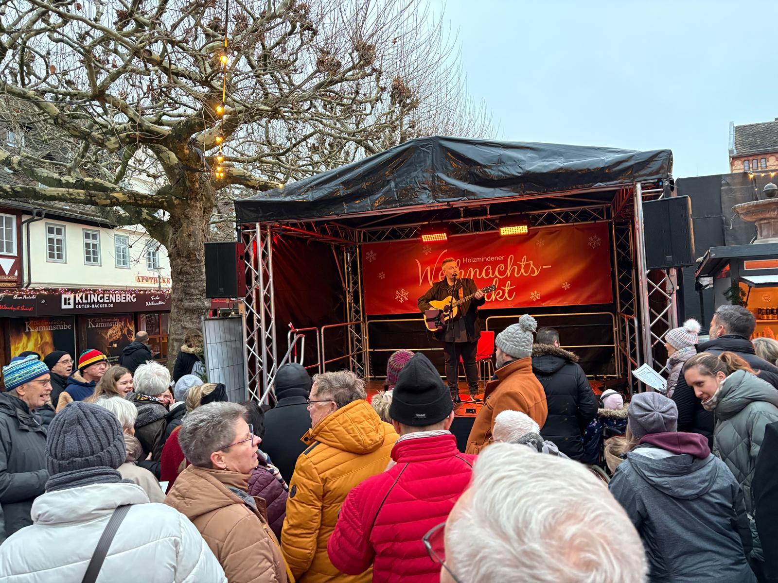 Ab 16 Uhr stand Sebastian Hegener auf der Bühne, um gemeinsam mit den Besuchern Weihnachtslieder zu singen. Zahlreiche Menschen versammelten sich pünktlich vor der Bühne, sodass der Holzmindener Marktplatz gemeinsam acht Lieder anstimmte. Den Auftakt machte „In der Weihnachtsbäckerei“, beendet wurde das gemeinsame Singen klassisch und besinnlich mit „Stille Nacht, heilige Nacht“.