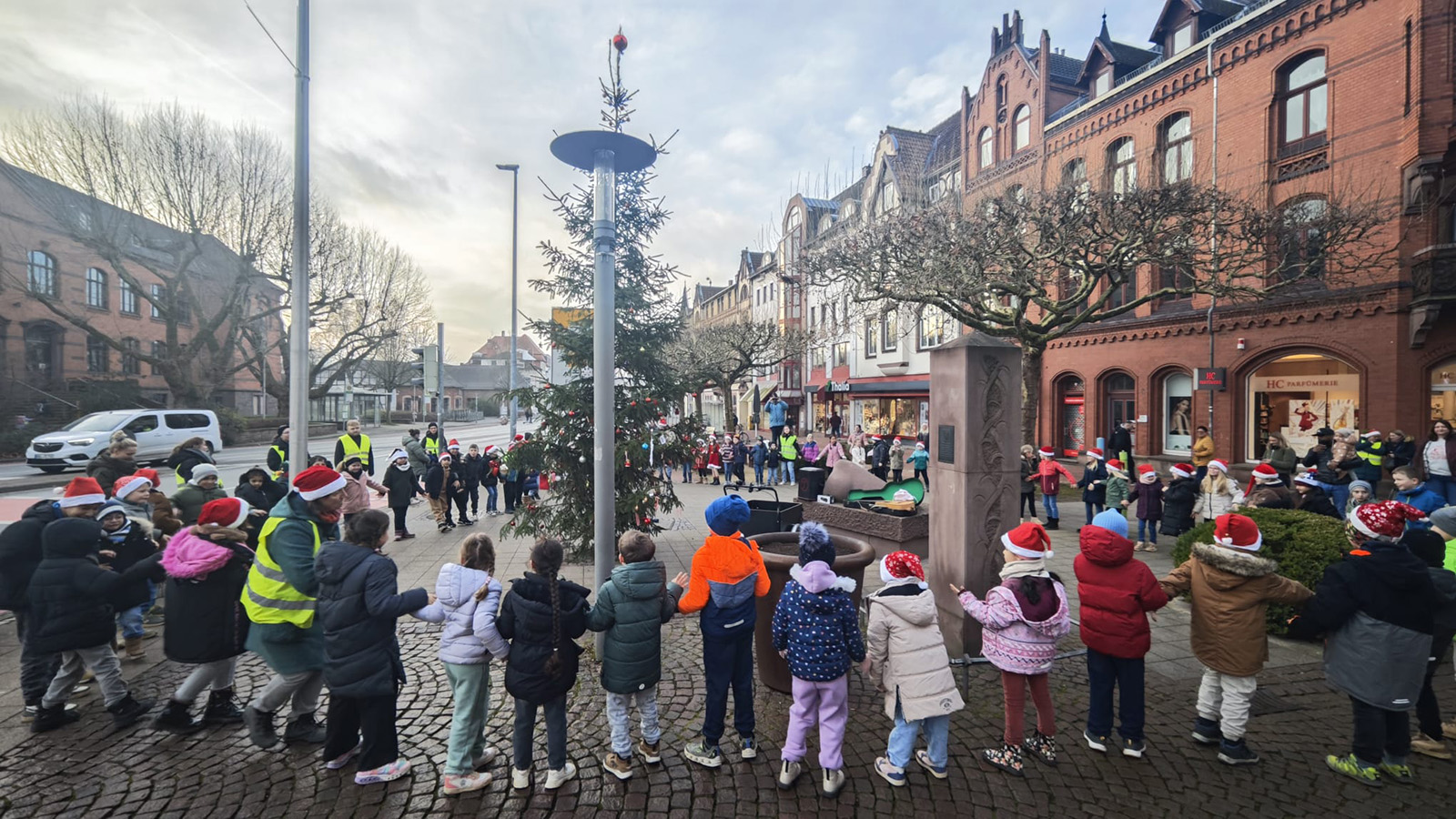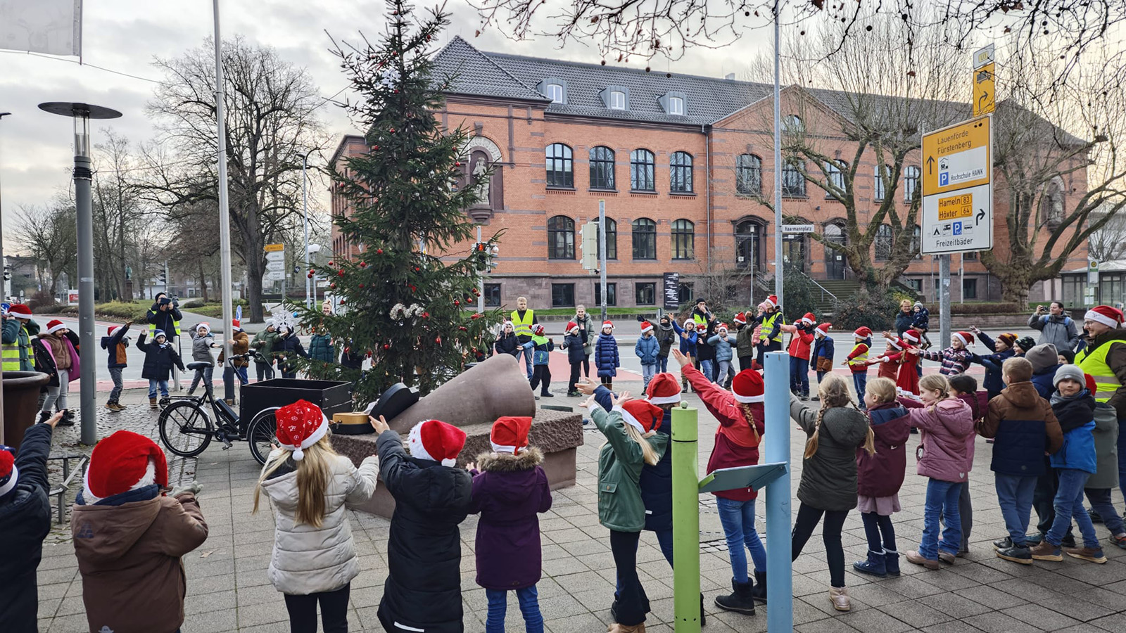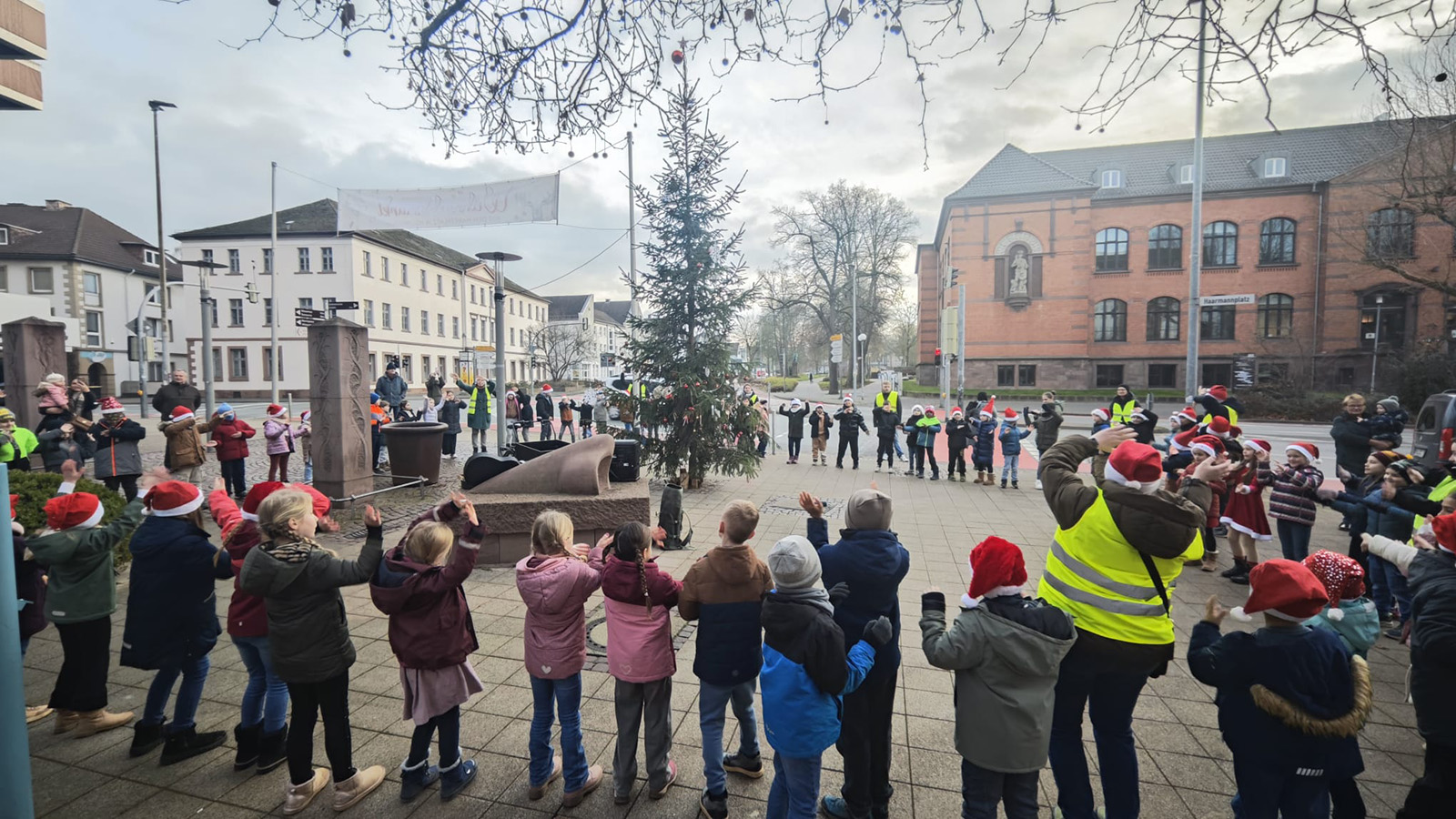 Holzminden (zir). Am 18. Dezember verwandelte sich der Haarmannplatz in einen Ort vorweihnachtlicher Freude. Schülerinnen und Schüler aller zweiten Klassen der Astrid-Lindgren-Schule trafen sich dort rund um den sogenannten „Ugly Christmas Tree“, um gemeinsam eine kleine Weihnachtsfeier zu gestalten – und damit bewusst einen positiven Gegenpol zu den zuletzt überwiegend negativen Schlagzeilen rund um den ungewöhnlichen Weihnachtsbaum zu setzen.