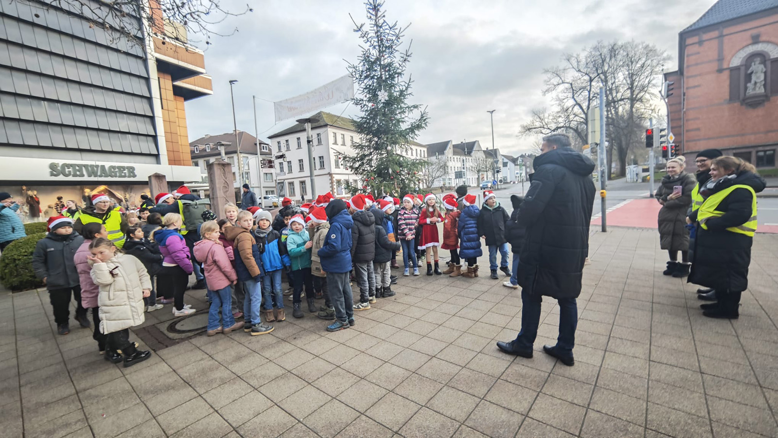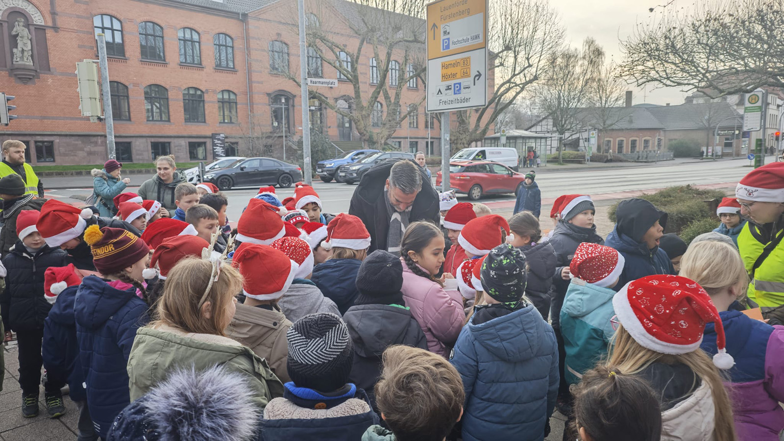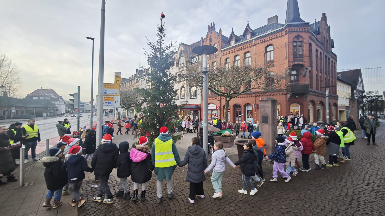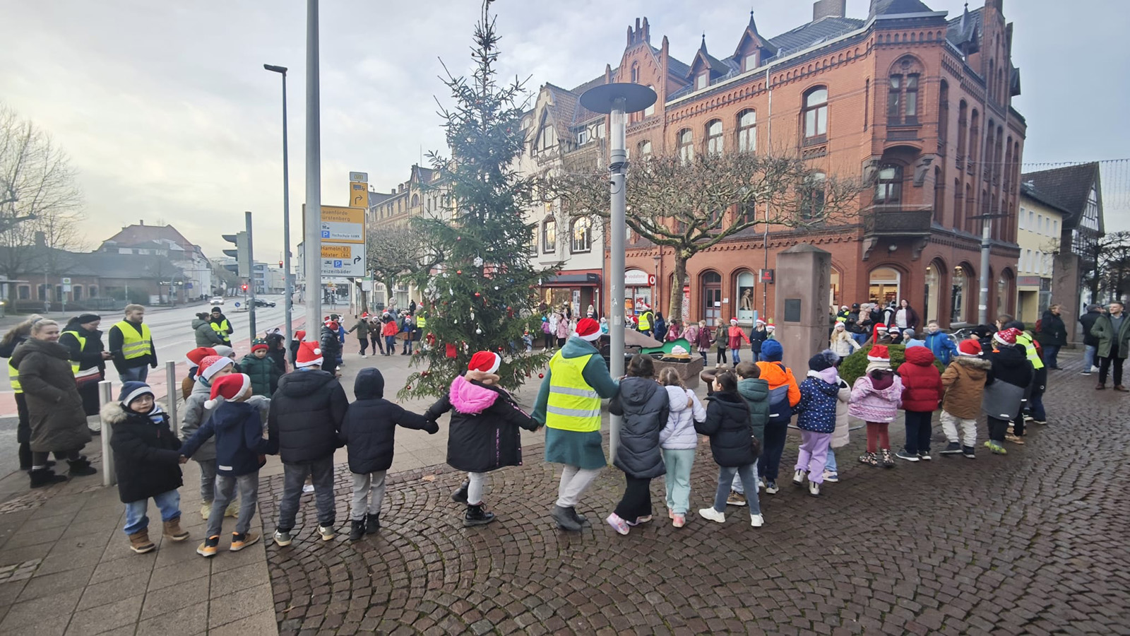 Holzminden (zir). Am 18. Dezember verwandelte sich der Haarmannplatz in einen Ort vorweihnachtlicher Freude. Schülerinnen und Schüler aller zweiten Klassen der Astrid-Lindgren-Schule trafen sich dort rund um den sogenannten „Ugly Christmas Tree“, um gemeinsam eine kleine Weihnachtsfeier zu gestalten – und damit bewusst einen positiven Gegenpol zu den zuletzt überwiegend negativen Schlagzeilen rund um den ungewöhnlichen Weihnachtsbaum zu setzen.