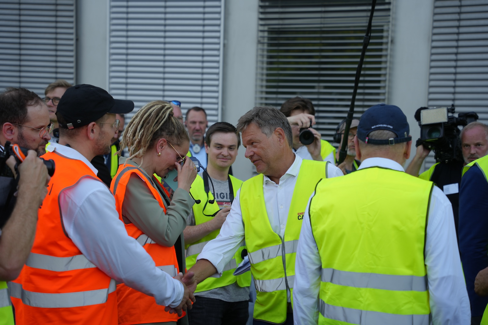 Zu Beginn des Treffens trat Habeck in den Dialog mit den Demonstrierenden. Die Betriebsratsvorsitzende von Stiebel Eltron, Elke Grimme, schilderte ihm die Kurzarbeitssituation und betonte: „Wir brauchen Ihre Versprechungen, denn sonst können wir in Deutschland als Hersteller nicht mehr überleben.“ Sie forderte eine Deckelung des Strompreises sowie eine langfristige und verlässliche Heizungsförderung. „Solange ich Minister bin, werden wir die Förderung aufrechterhalten“, erklärte Habeck.