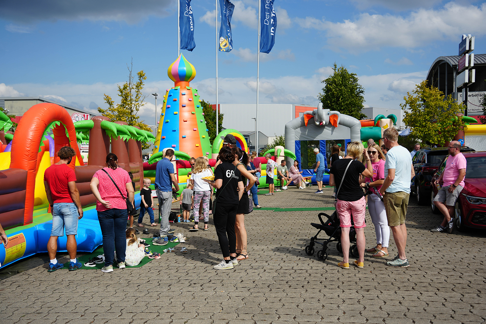 Bei strahlendem Sonnenschein verwandelte sich die Verkaufsfläche in ein kleines Volksfest, das mit seiner Vielfalt sowohl für Kunden, Freunde als auch Interessierte viel zu bieten hatte. Bereits bei der Parkplatzsuche weckte der Anblick des Besucheransturms Neugier. Auf dem VW-Gelände zeichneten sich die ersten Attraktionen des Jubiläumsfests ab: Eine riesige, bunte Hüpfburg wurde von zahlreichen kleinen Besuchern eifrig erobert. Wer es etwas ruhiger angehen wollte, konnte sein Glück am Glücksrad versuchen und tolle Sachpreise gewinnen. Nur wenige Schritte entfernt waren Fahr- und Bowlingkünste der Besucher gefragt: Beim „Autobowling“ nahmen Teilnehmer in einem VW T-Roc Platz, der an der Front mit Kissen gepolstert war. Mit diesem Fahrzeug galt es, einen ballonartigen Ball gegen Kegel zu stoßen und dabei einen „Strike“ zu erzielen.
